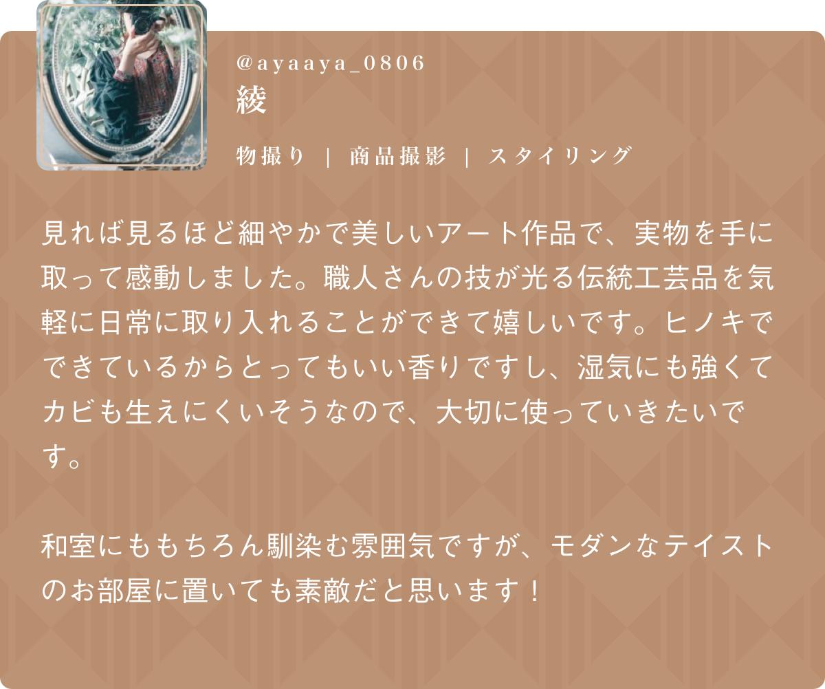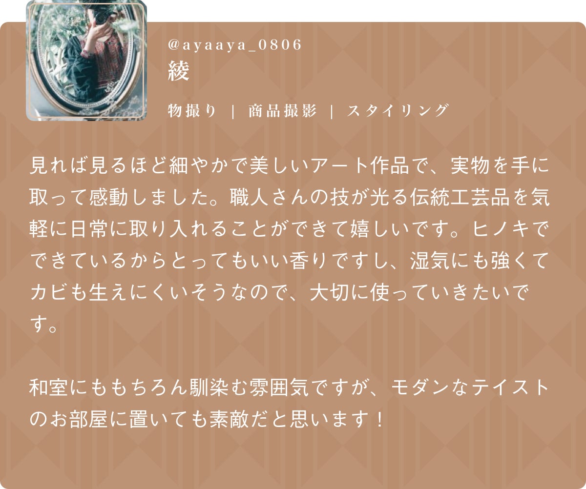 2021/11/15 17:30支援者の皆様お世話になっております。本日までのたくさんのご支援、誠にありがとうございます。本プロジェクトはまもなく終了となります。✥ 台湾伝統工芸 × 現代アート ✥現代の暮らしに寄り添う「フローラ柄ガラス+組子細工」のご使用を提案!縁起の良い文様なので、贈り物におすすめです。さらに素材にこだわって良質なカナダヒノキを採用し、 ヒノキの手触りと香りをそのまま楽しめます。引き続き一生懸命製作を進めてまいりますので、楽しみにお待ちいただければと思います。終了まで残りわずか6時間ですが、ご拡散とご支援のほど、よろしくお願い申し上げます。 もっと見る