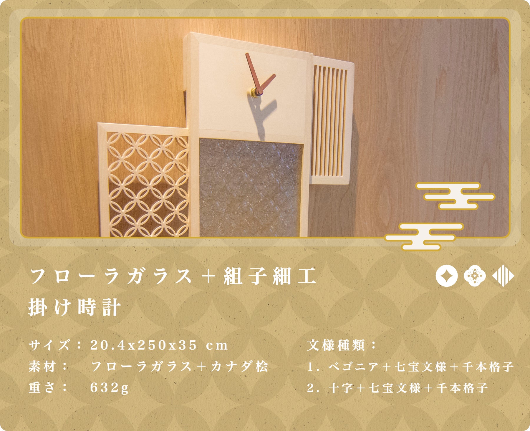 【ガラスと組子細工が施された掛け時計】柄3つを同時に楽しめる掛け時計。粘着力の高いテープが付属しており、壁面に貼り付けて使用することも可能。