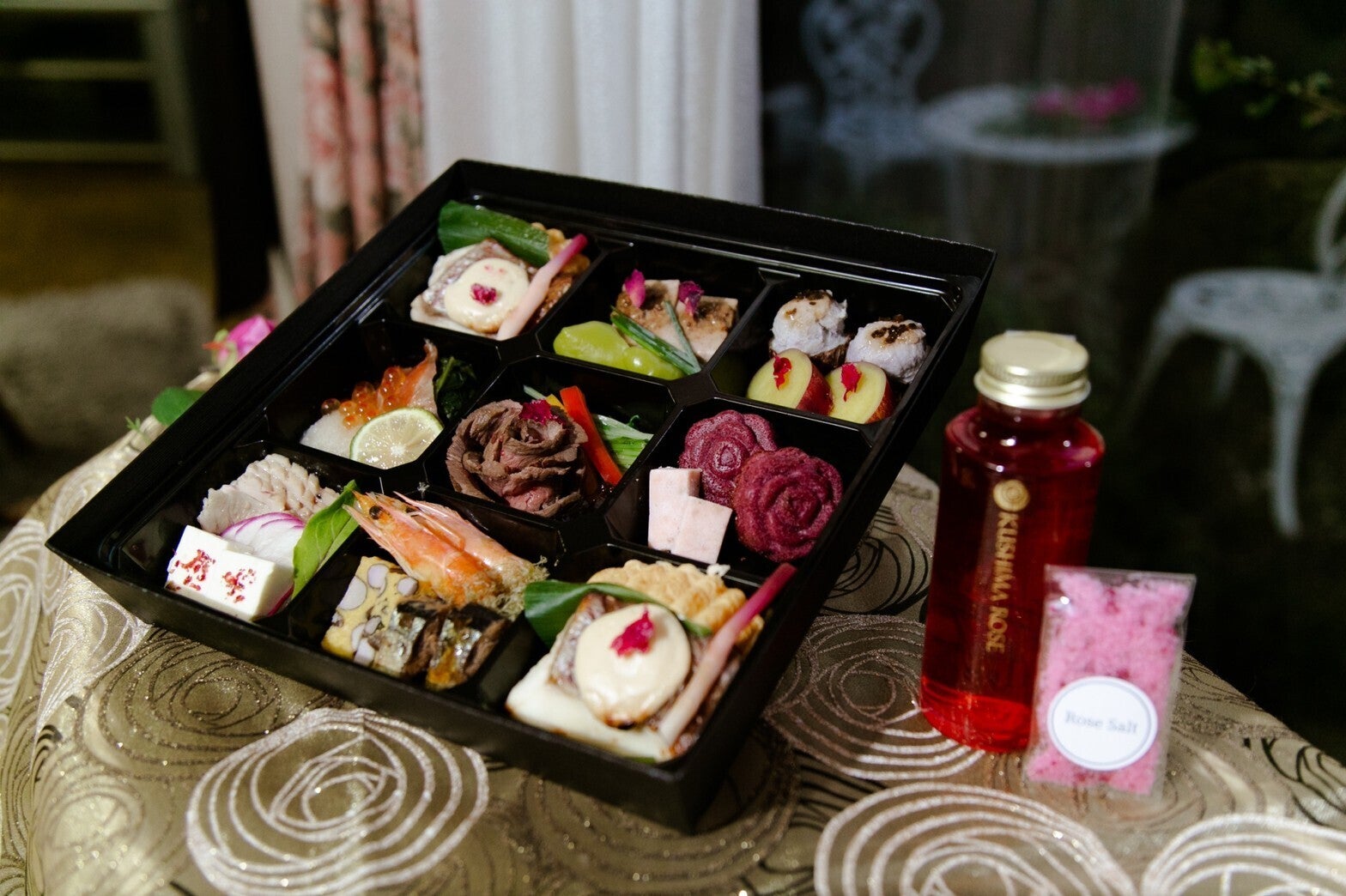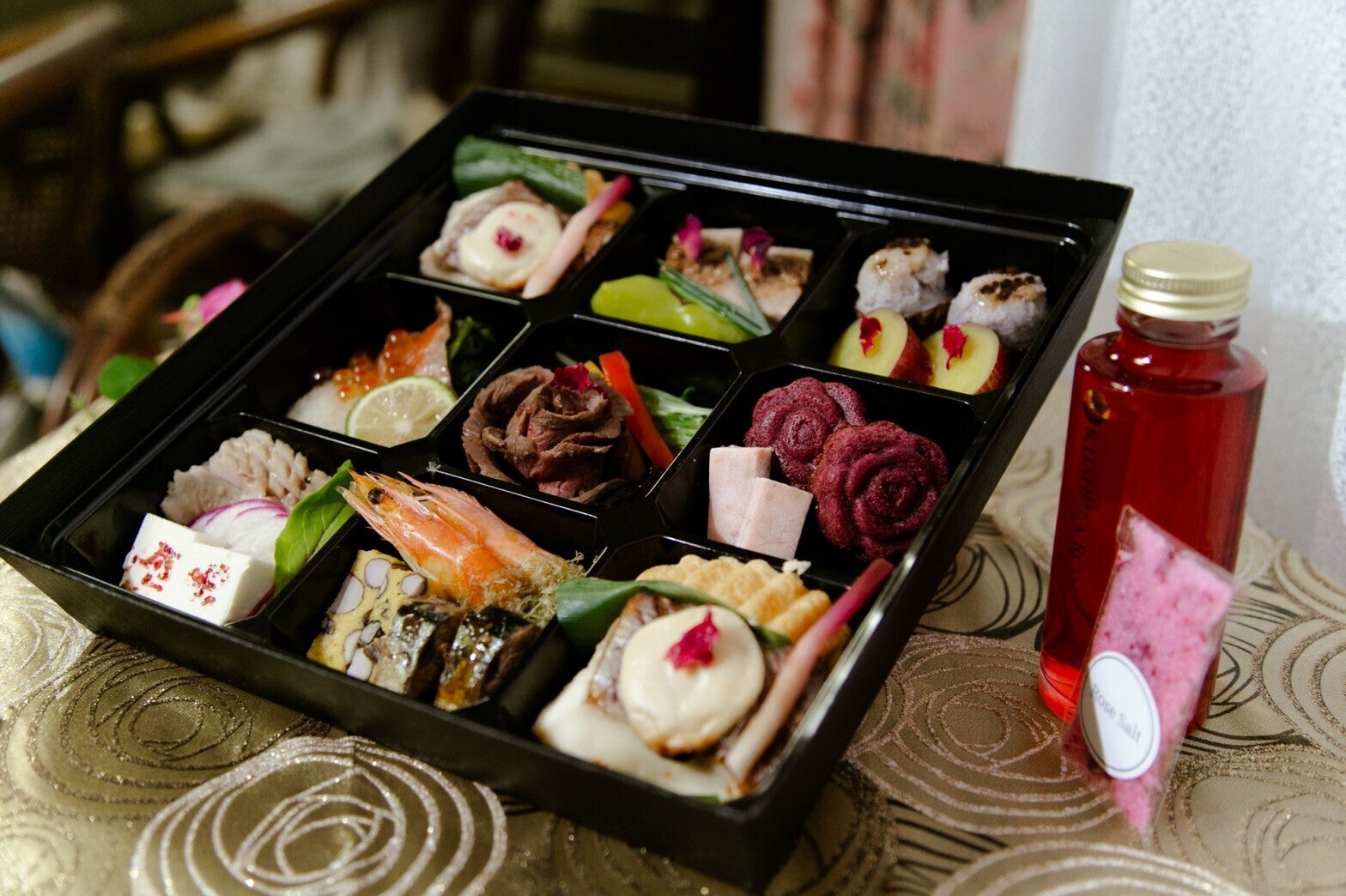 バラ懐石は2名様分、玖島ローズの代表商品「香るバラのしずく(バラシロップ)125g」と「香るバラの塩10g」を添えてお送りいたします。