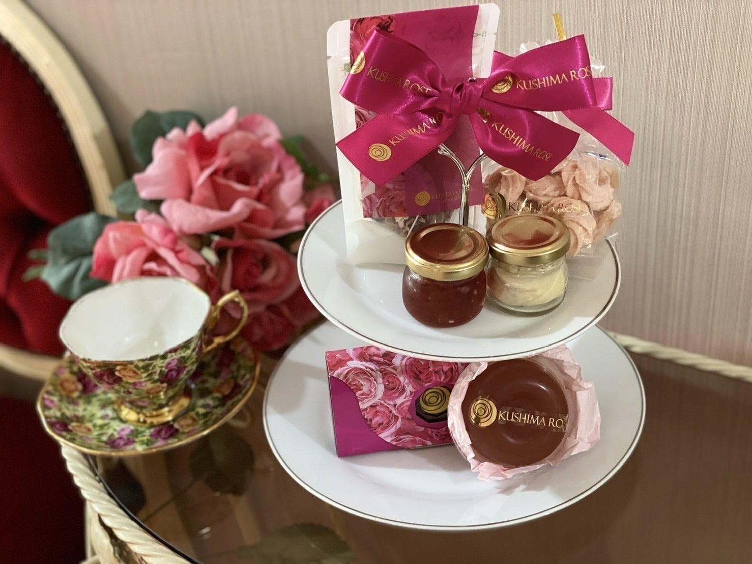 2021/10/28 14:40リターン品の一つ、ローズアフタヌーンティーの写真を撮影していただきました!本文にも記載しておりますが、リターン品のお取り寄せアフタヌーンティーは以下の通りです。◆ケーキスタンド(2段)(ココット・スプーンは付いてきません)◆神戸のパティシエ井上さんのバラモリ限定マドレーヌ×2◆ 香るバラのスコーン×2個◆ 香るバラのしずく(バラシロップ)125g×1◆ 香るバラのバター25g×1◆ 香るバラのジャム25g×1◆ パヴェドローズ(バラの生チョコ)5粒入り×1◆ 香るバラのお茶5TB×1◆ 香るバラのカップケーキ×2◆ 香るバラのラングドシャ2枚◆ ローズキャンディ×2◆ ローズライフバランス(バラのサプリメント)×2玖島ローズ自慢の商品を中心にお届けいたします。更にマドレーヌは、“バラモリ”限定を予定していたもので、公式Webサイトでは販売はしておらず、今後の販売の予定も決まっておりません。バラモリ協力者のパティシエ井上さんの手作りのものです。今回だけのスイーツを是非お楽しみください! もっと見る
