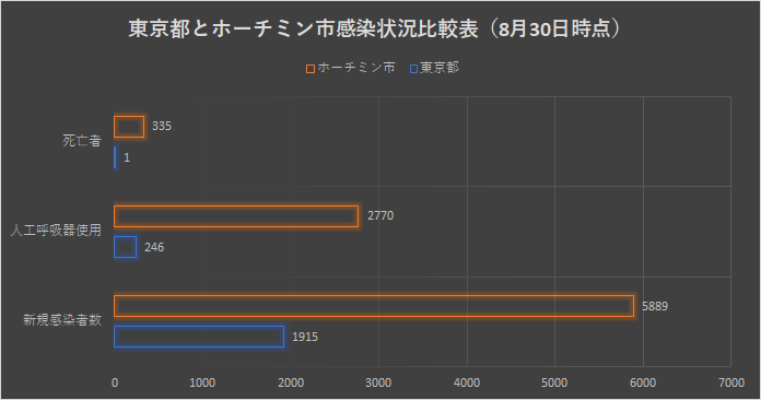 新規感染者数はほとんど同じ東京都とホーチミン市ですが、ホーチミン市では死亡率が高く、平均で一日300名以上の人が亡くなっており、この1か月で約9000名の死亡者を 出しています。これは東京の死亡者数の十倍を超えた数字です。