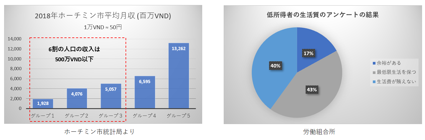 ホーチミン市は、ベトナム国最大都市として知られていますが、その6割の市民は月給2.5万円以下で、貯金ができているのはわずか17%にすぎません。毎日家族を養うだけで精一杯となっている人がほとんどです。