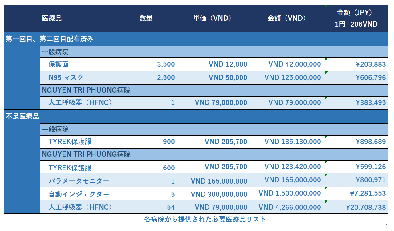 ※本プロジェクトはAll-Inでの実施となるため、支援総額が期日までに目標金額に届かなかった場合でも、必要医療品リストの中から購入し、2021年10月11日までに、ホーチミン市に送金し、物資調達次第、病院に必ず届けます。