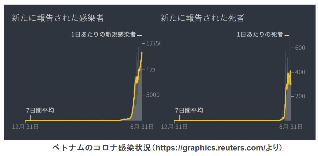 7月から急速に新型コロナウイルスのデルタ株の感染が広がり、7月末から8月中旬にかけて、東京都もホーチミン市も、毎日5千人以上の新規感染者を出しています。