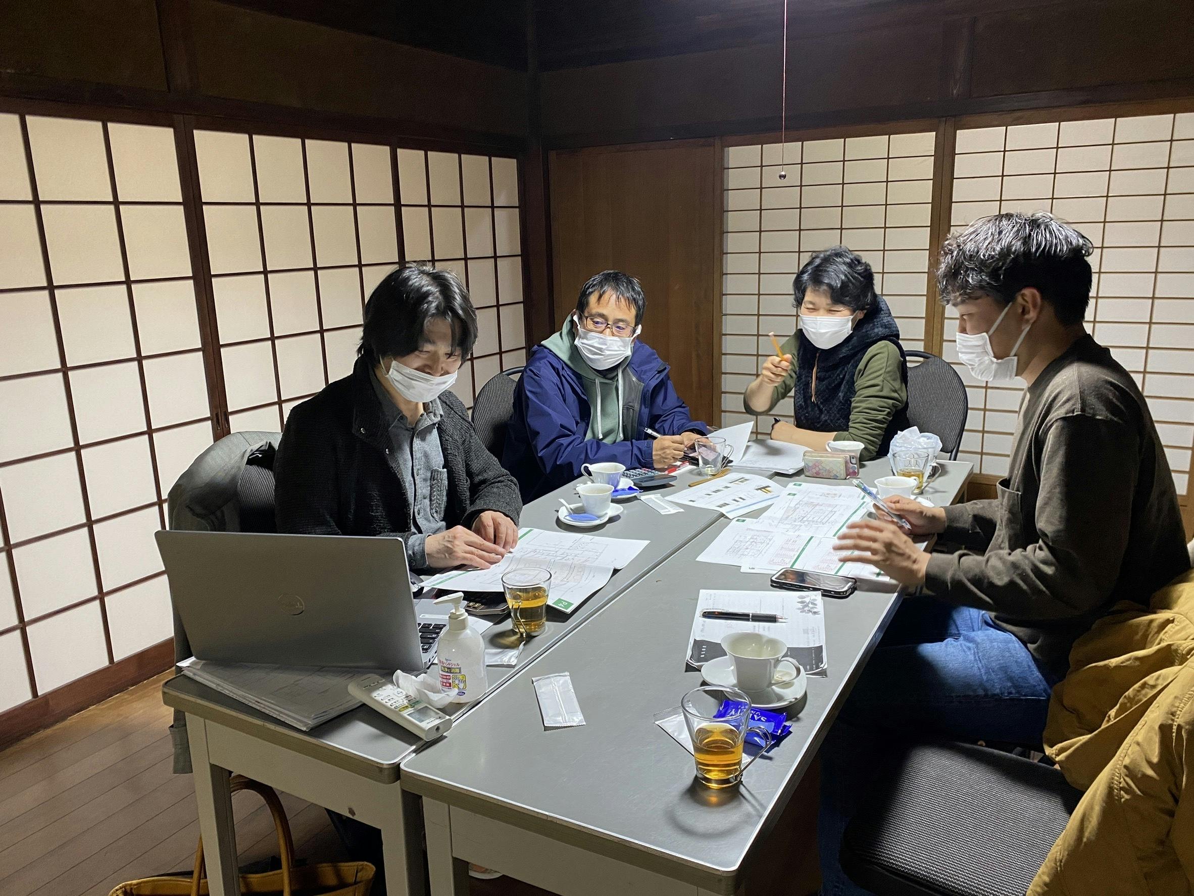 お世話になっている兵庫空き家相談センターの頼もしいお二人、建築士の橋詰さんと不動産鑑定士の関さん。そしてオーナーの宇賀さんとで集まり対策を検討。プロの意見をベースに自分たちで工夫できる部分を洗い出して一定の方向性を見出しました。