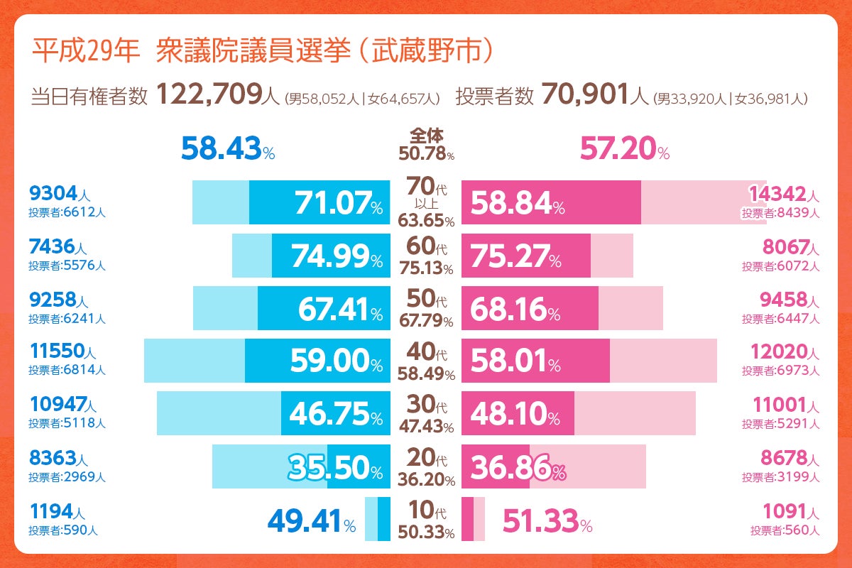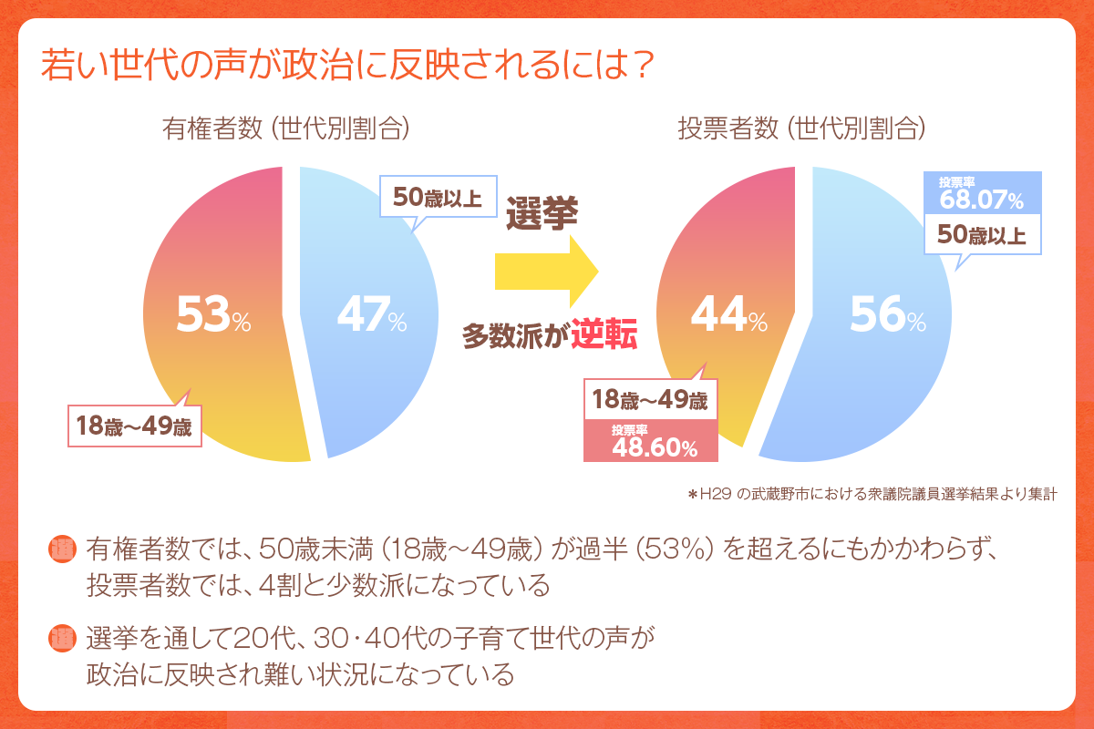 武蔵野市の有権者は122,709人(H29衆院議員選挙時)です。18歳から49歳までの有権者は全体の53%で過半数を超えています。しかし、選挙の投票者数では50歳以上のかたが56%となり逆転します。どうしても若い世代の声は届きにくくなってしまいます。
