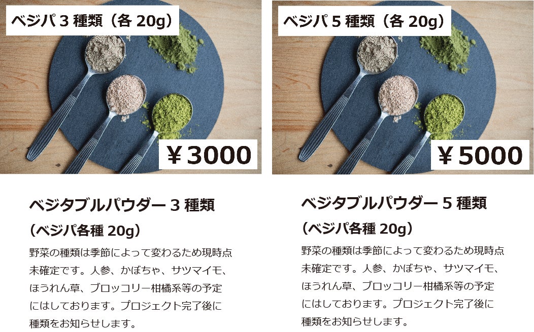 ●「ベジタブルパウダー」装置の導入、原料仕入れ、販促、外注費、支援者の皆様への配送の費用