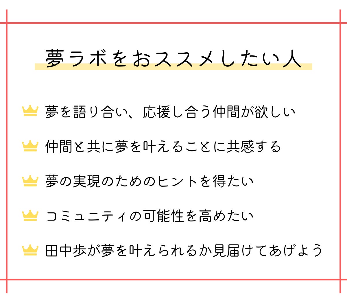 今までも、そしてこれからも、夢を語り、叶える仲間が集う、『夢ラボ』というコミュニティを開催し続けます。