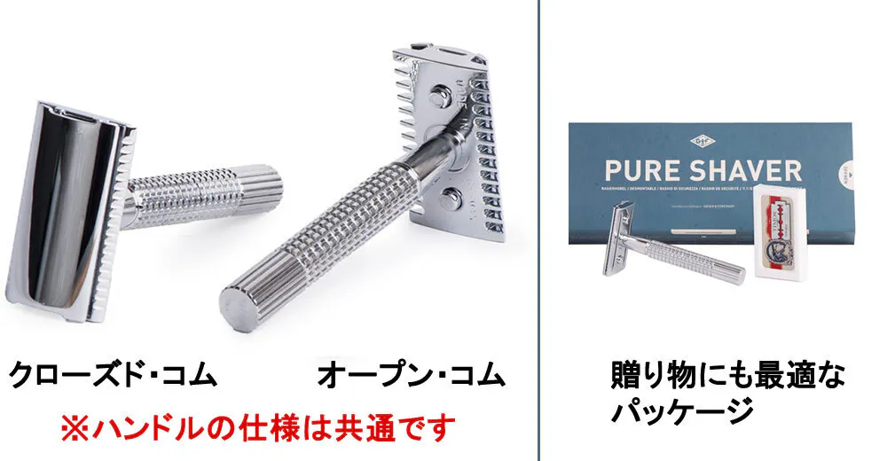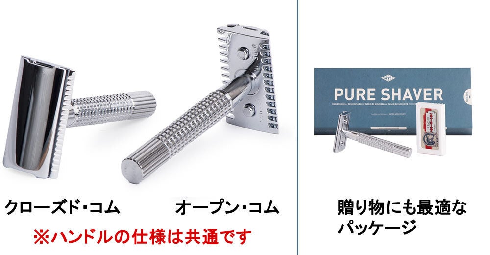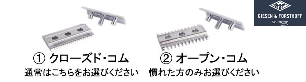 A : 普段ドラッグストアのT字カミソリや電動シェーバーをご利用の方は、クローズド・コムをお選びください(ほとんどの日本人がこちらにあたりますので、通常はクローズド・コムをお選びください:初めてダブルエッジレザーをご利用の方、肌の強くない方はクローズド・コムが適しています)。