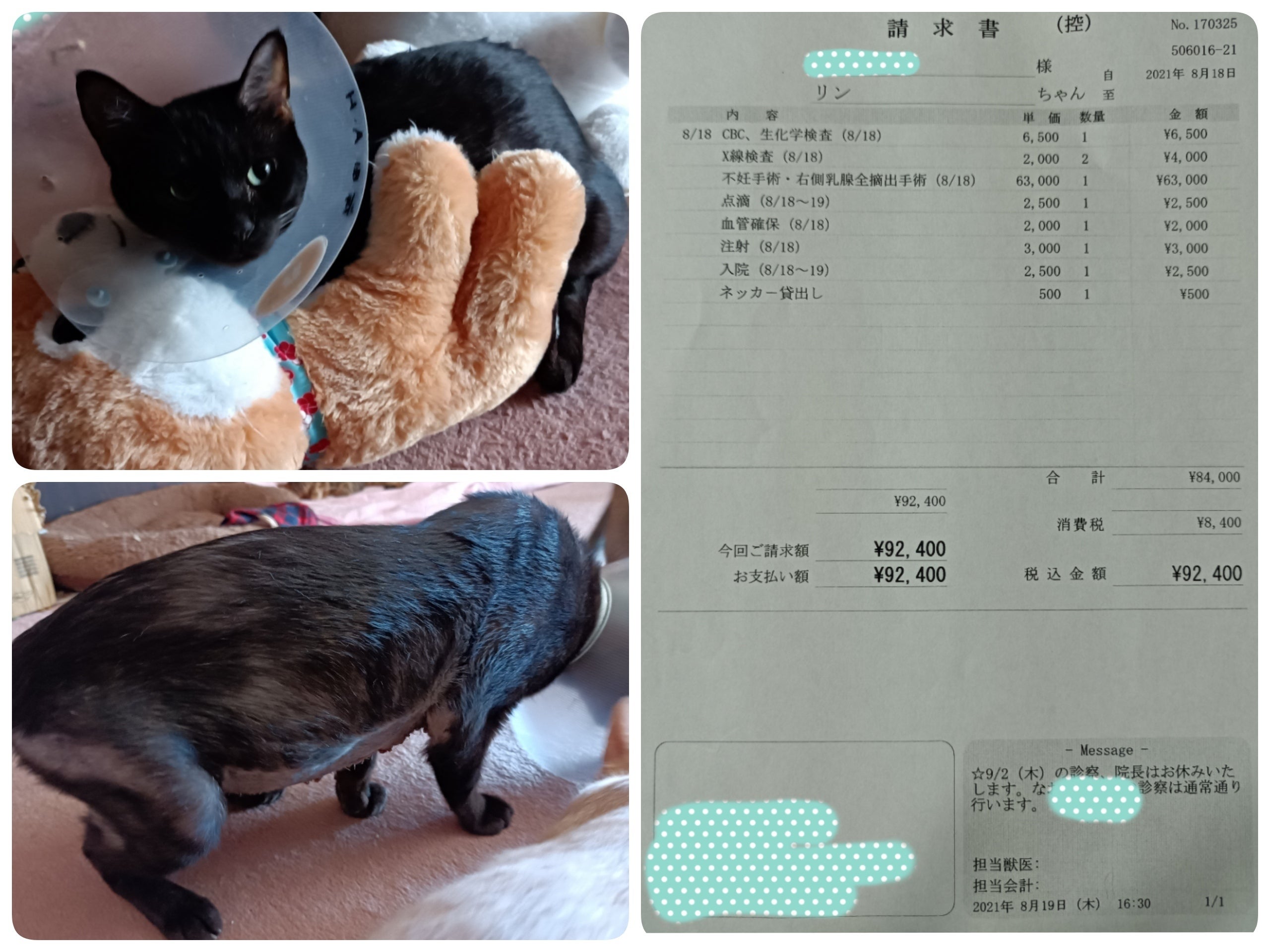 直近では、右側乳腺全摘出手術 と避妊手術の同時手術した高齢猫ちゃんがいます。9月17日に左側乳腺全摘出手術を控えております。
