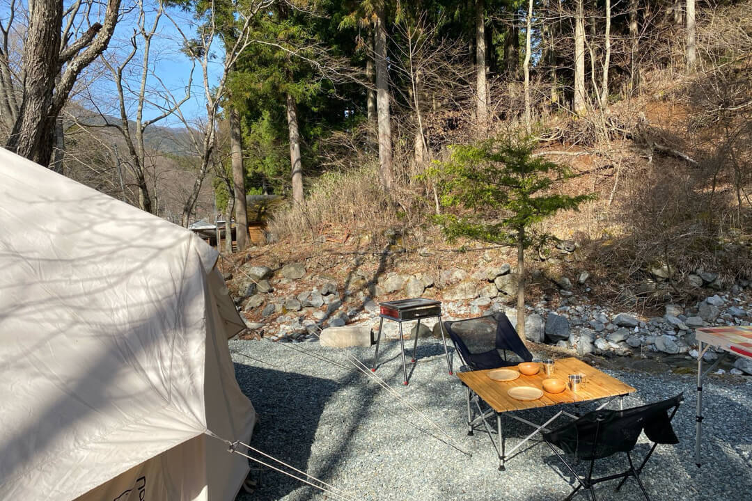 キャンプ場は都会の喧騒から離れた山梨県道志村のセンタービレッジキャンプ場。