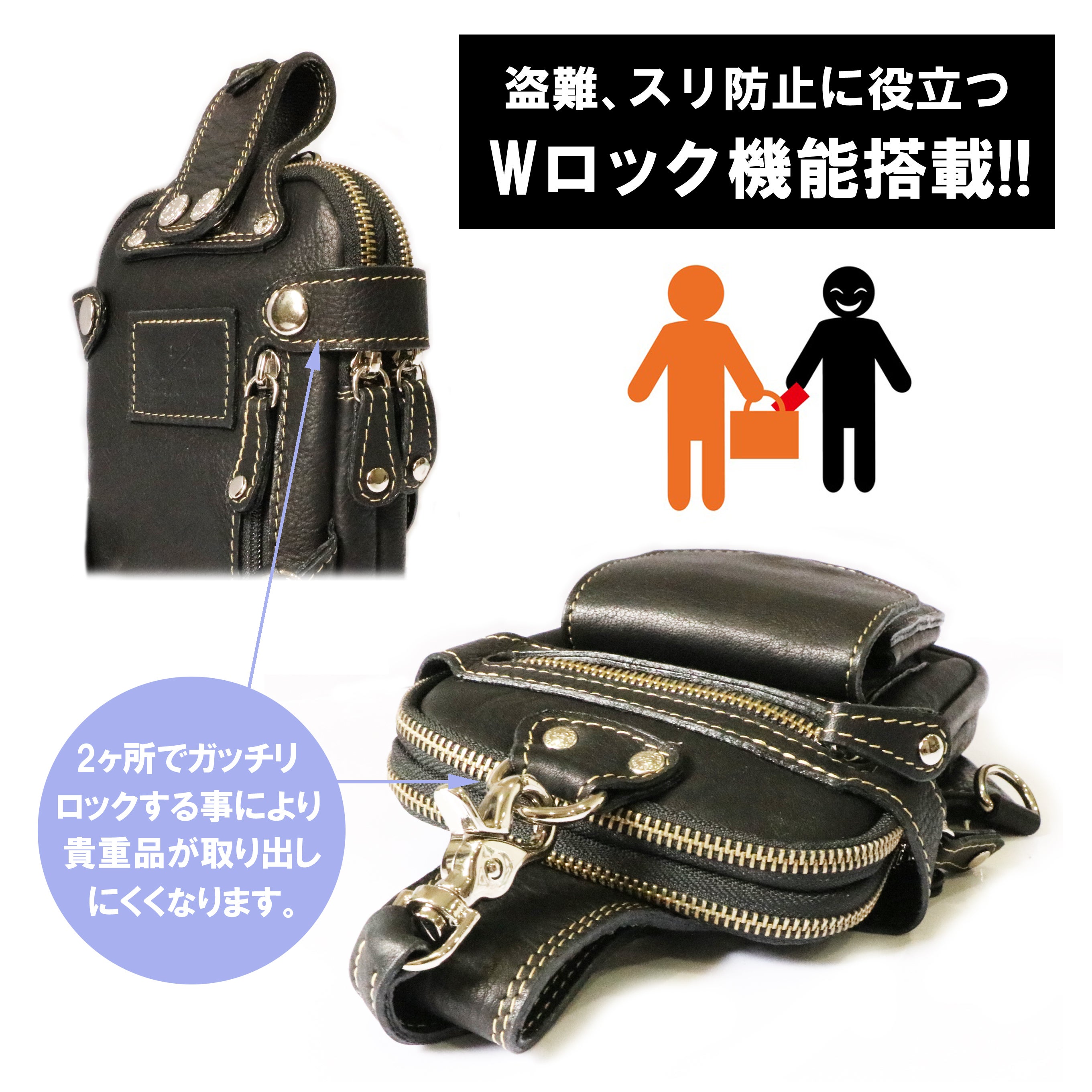 スリ対策として少しでも中の物を取りづらくする為にWロック機能を採用しました。