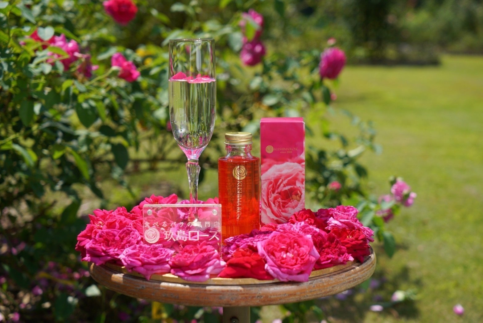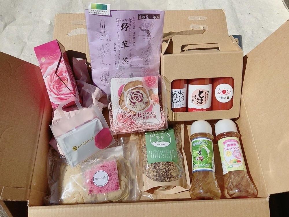 今回のプロジェクトの発起人、食べるバラの専門店「玖島ローズ」から、約100枚分の花びらを使用した「香るバラのしずく」(シロップ)と「香るバラのラングドシャ」「ローズキャンディー」「バラの塩」をお届けします。