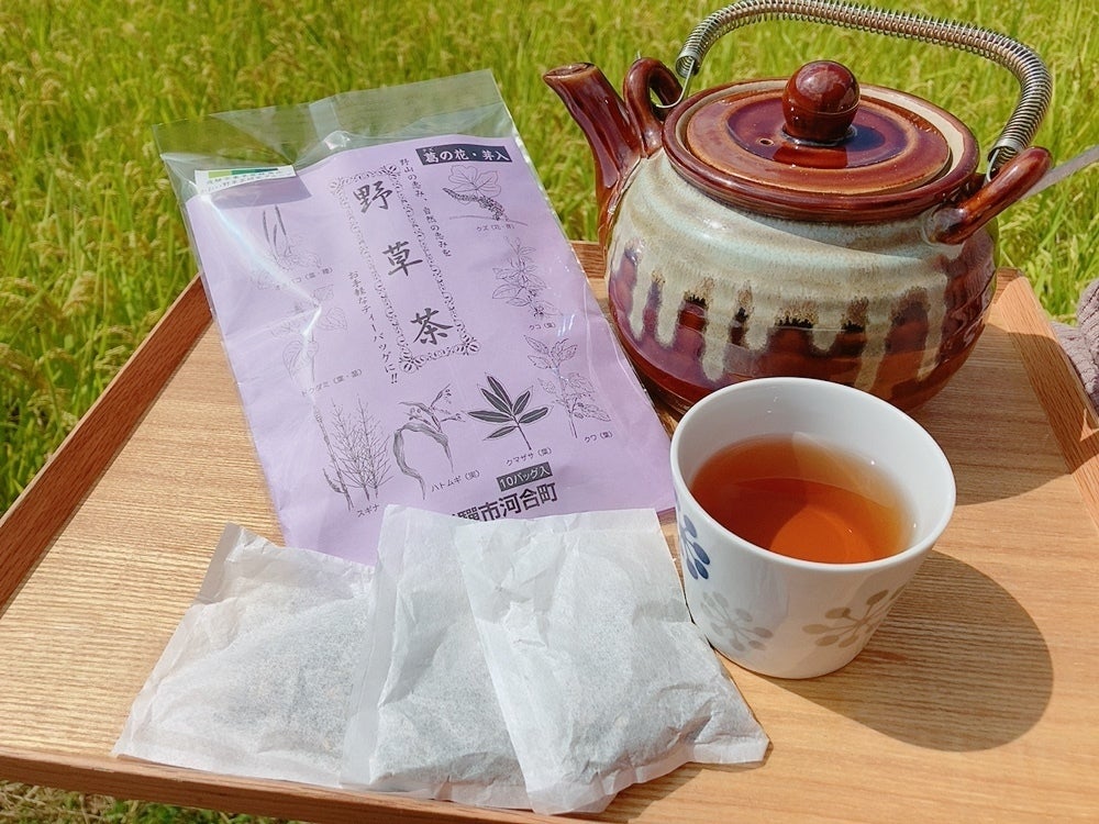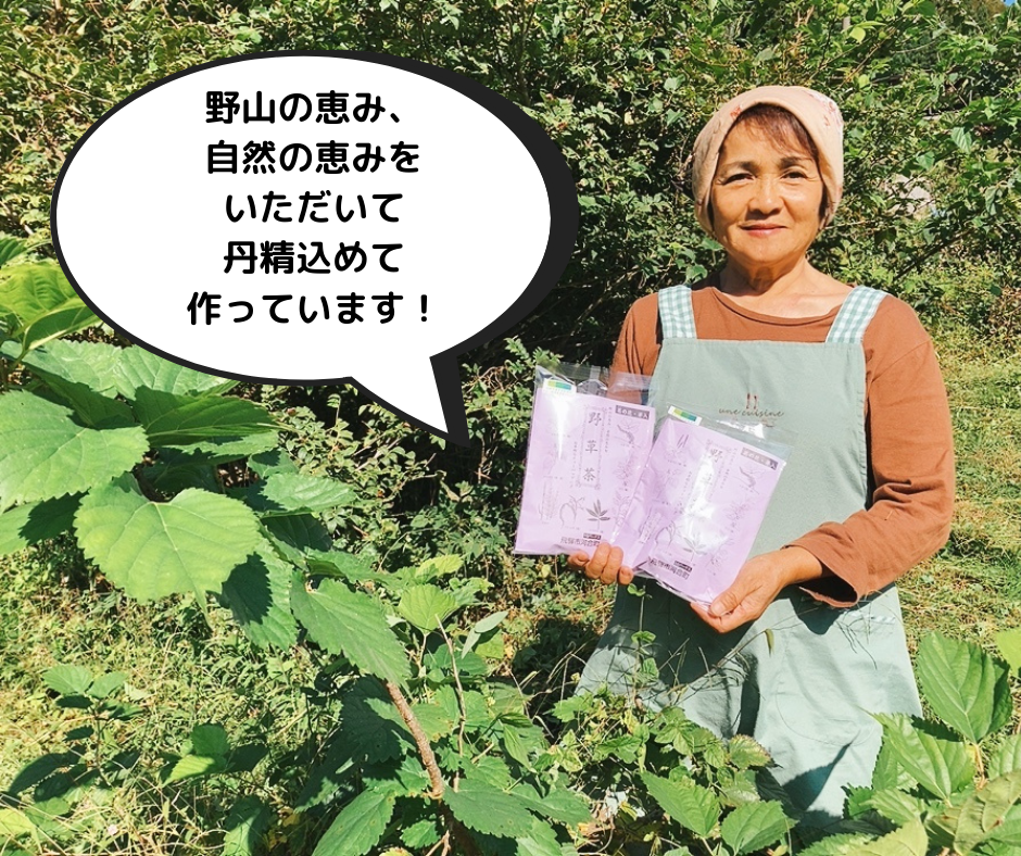 河合町の主婦がひとつひとつ手作業で採取し心をこめて作っている「野草茶」です。クワ、オオバコ、クマザサ、ドクダミ、スギナなど飛騨の森からミネラルを吸い込んだ野草を、ひとつひとつ手作業で採取した体に優しいお茶です。