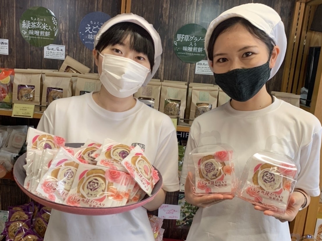 3年熟成味噌とこだわりの国産原材料を使い、1枚1枚心を込めて手作りされた飛騨のみそ煎餅に、ちょこっとバラの花びら入り味噌煎餅が新登場!