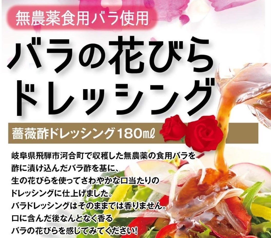 河合町の入浴施設ゆぅわ〜くハウスでしか買うことができない「薔薇酢ドレッシング」です。地元で無農薬で栽培された食べるバラ活用のため、2005年に開発された商品です。