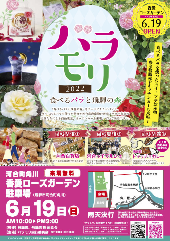 2022/06/14 16:26「#食べるバラ」で日本をバラ色に!無農薬の食べるバラスイーツ&森を飛騨からお届けをご支援してくださった皆様昨年は、あたたかいご支援をいただき本当にありがとうございました。この度、念願の「バラモリ2022」をリアルで開催できることになりました。これは、皆様からのご支援や、温かい励ましメッセージのおかげです。ありがとうございます!旬の食べるバラを使ったドリンクやスイーツ、地元の特産品、河合産トマトを使ったトマッチョカレー、小学生有志による河合っ子マルシェ、キッチンカーなどが並びます。旬のバラを楽しみに河合町へぜひお越しください。※体調のすぐれない方のご来場はご遠慮ください。※各自、ご自宅で検温・出店スペースでのマスク着用にご協力ください。【日時】令和4年6月19日 日曜日10:00~15:00※ただし、各出店者さん売切次第終了となります。【場所】香愛ローズガーデン岐阜県飛騨市河合町角川780【内容】食べるバラや飛騨の森に関する出店、キッチンカー出店【出店者さん】順不同 敬称略◆食べるバラ商品のお店食べるバラの専門店 玖島ローズ井之廣製菓舗◆キッチンカーぎゅう丸ポン菓子屋本舗はんちくてい◆河合町のお店やまさち工房河合野草茶研究グループ雪匠組河合っ子マルシェ河合百貨店最新情報はホームページまたはSNSでご確認ください。バラモリホームページバラモリfacebookバラモリ実行委員会 もっと見るリターンの商品発送のお知らせ
