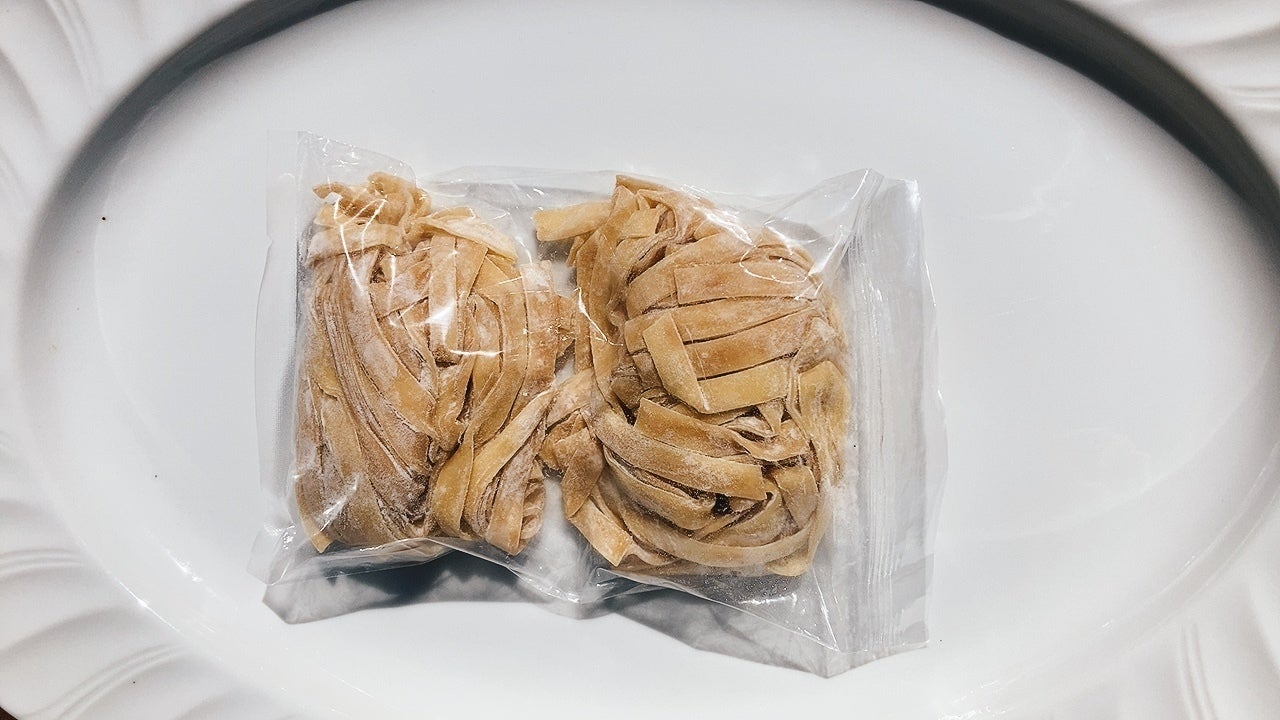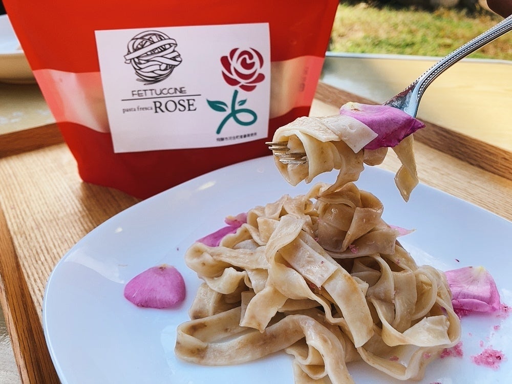 岐阜県産小麦粉タマイズミに河合町の食べるバラを練り込んで、ほんのりバラが香る生パスタができました。のどごしがつるっとしていてもっちりとした食感です。バラの風味を味わってほしいので、食べ方はごくシンプルにセットでお届けするバラの塩やバターを添えてどうぞ。