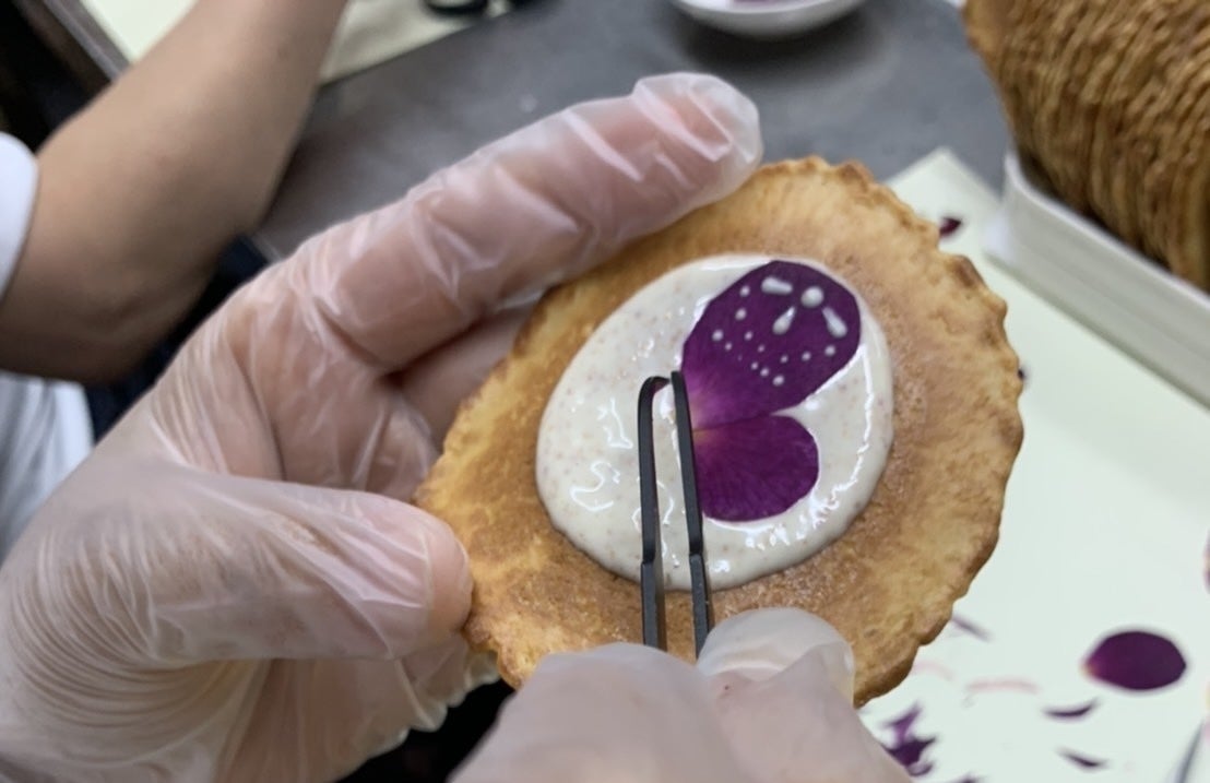 職人さんが煎餅1枚1枚に手作業で、バラの押し花を蝶やバラの形に貼り付けているんです。ホワイトチョコにもバラが練り込んであり、口に入れるとほのかにバラが香ります。サクっと軽い食感で子供からお年寄りまでどなたでも美味しくいただけます。