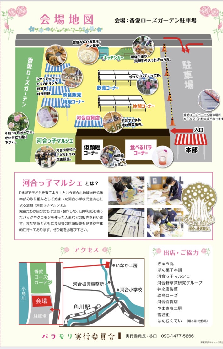 旬の食べるバラを使ったドリンクやスイーツ、地元の特産品、河合産トマトを使ったトマッチョカレー、小学生有志による河合っ子マルシェ、キッチンカーなどが並びます。