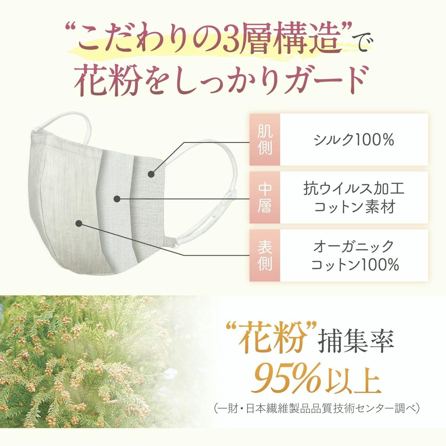 中材には「抗ウイルス加工」を施した綿素材を使用し、これから気になるインフルエンザウイルスの侵入や花粉の侵入を軽減します。
