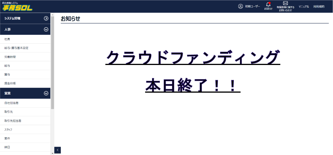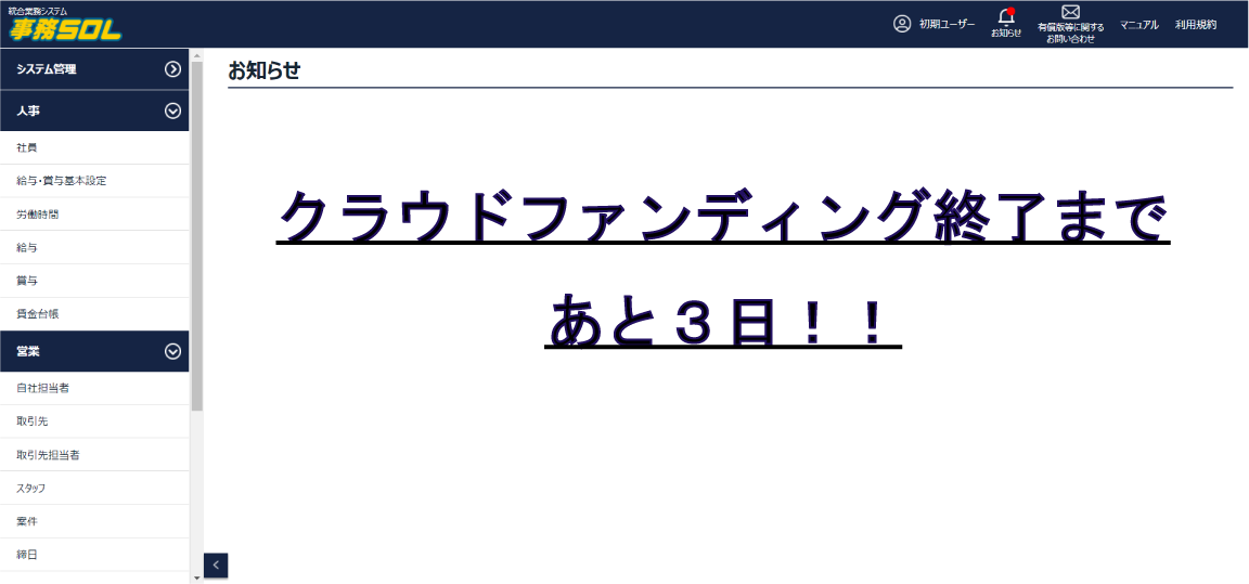 2021/11/29 19:11ついに本日、「事務SOL」のクラウドファンディングが終了します!一カ月強、ご支援・拡散にご協力くださいました皆さま、本当にありがとうございます!「中小企業を倒産の危機から救いたい」という想いから、中小企業の経営判断の支援ツール・業務効率化ツールである「事務SOL」のクラウドファンディングに挑戦してきました。このプロジェクトも本日:23:59で終了です。迷われている方は、ご支援くださいますと幸いです。残り日数 → 0日(本日23:59まで)残り金額 → 204,660円目標達成率 → 31%目標にはまだまだ届きませんが、引き続きご支援・拡散のご協力お願いします!!「事務SOL」は今後も、皆さまにとって便利で使いやすいシステムになるよう、改良・開発を続けていきます。23:59 、最後の最後まで「事務SOL」は走り続けます! もっと見る