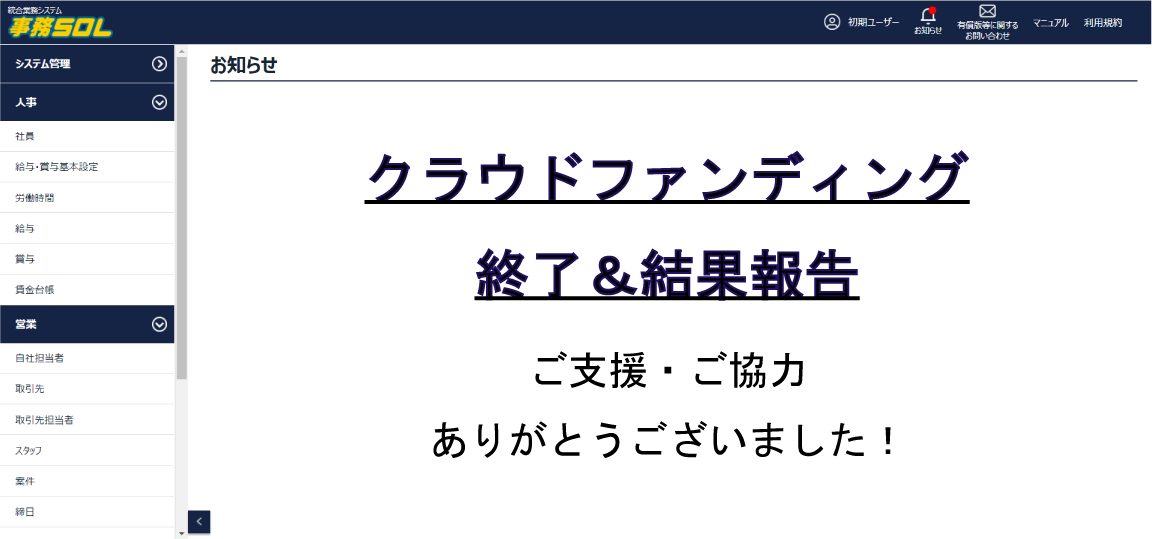 2021/11/30 19:08昨日23:59を持ちまして「事務SOL」のクラウドファンディングが終了しました。最終金額 95,340円支援者 26人目標達成率 31%目標には届きませんでしたが、それでも26人の方にご支援をいただけ、拡散のご協力をいただけたことを嬉しく思っています。ご支援・拡散にご協力くださった皆さま、本当に本当に!ありがとうございました!! これからリターンの準備を始めます。ご支援くださった方は、楽しみにお待ちください(^^♪今回いただいた支援金を「事務SOL」の開発費用にあて、より良いシステムを作っていきます。今度とも「事務SOL」をよろしくお願いします。 もっと見る