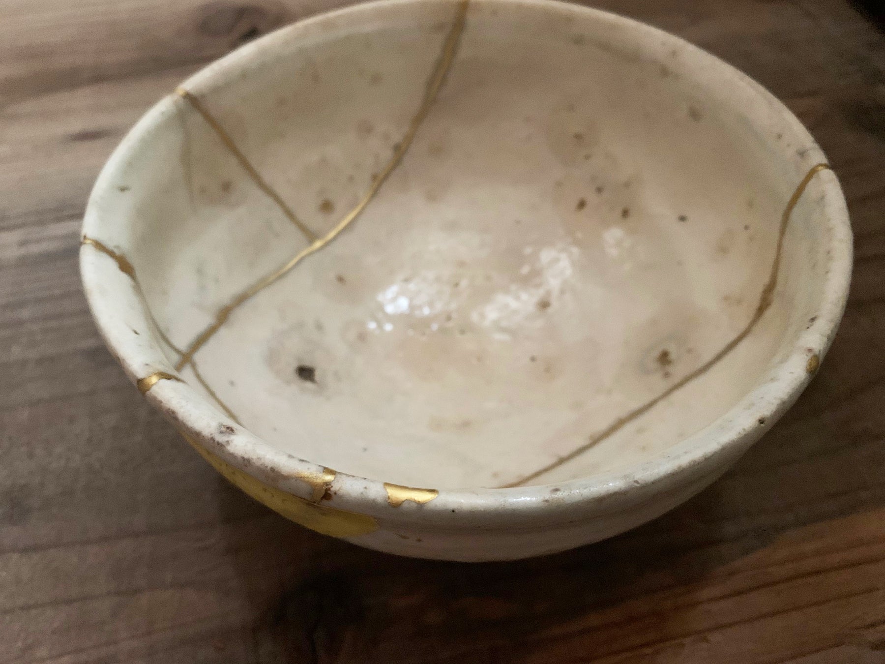 欠け、割れ、ひびなどで破損した陶磁器を漆で繕い、仕上げに繕い部分に金粉を蒔き、破損前とはまた違った魅力を生み出す伝統工芸です。