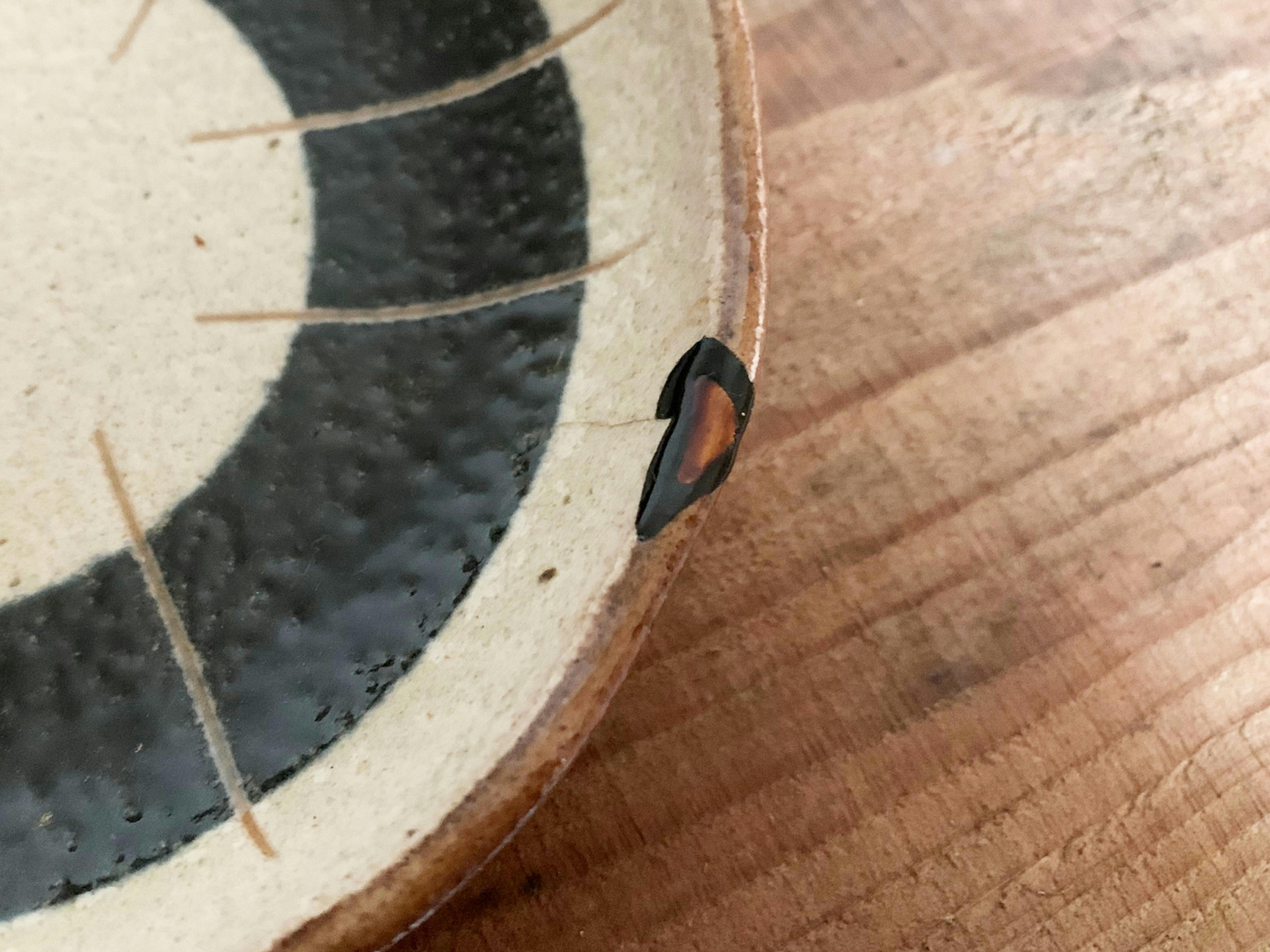 縁に欠けがありました。欠け部分は石粉と漆を混ぜたパテで埋めています。