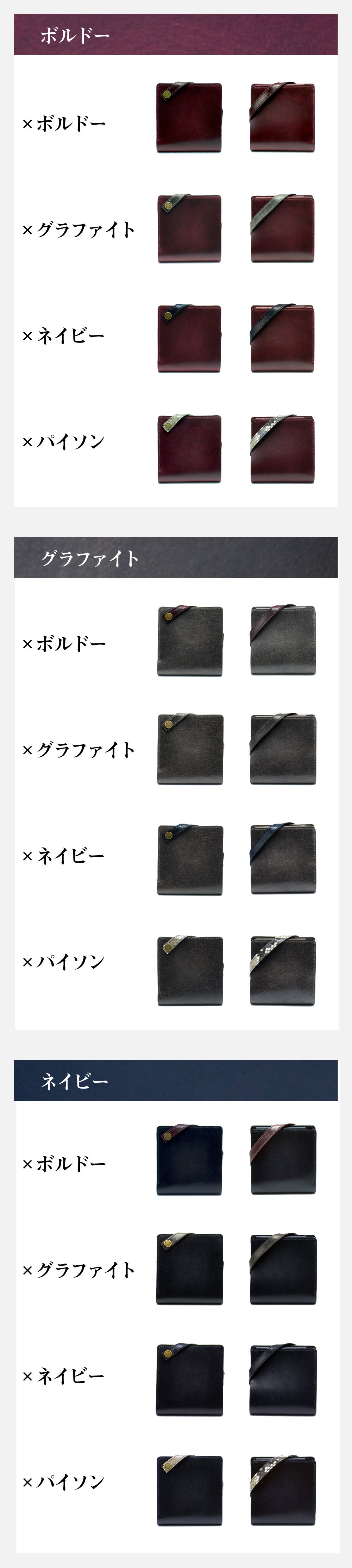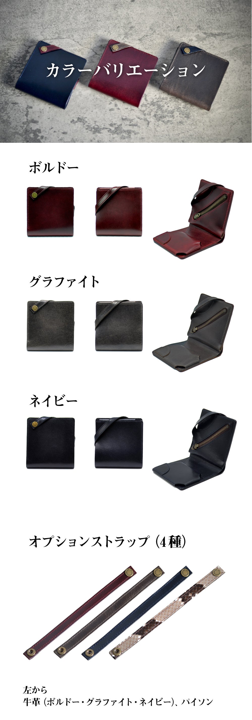 実用性に優れた『コーナーストラップ™』ですが、その特徴的な見た目が「財布のアイコン」としても機能しています。交換可能となっているため、色や素材を変えて「遊べる財布」を楽しめます。