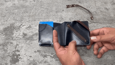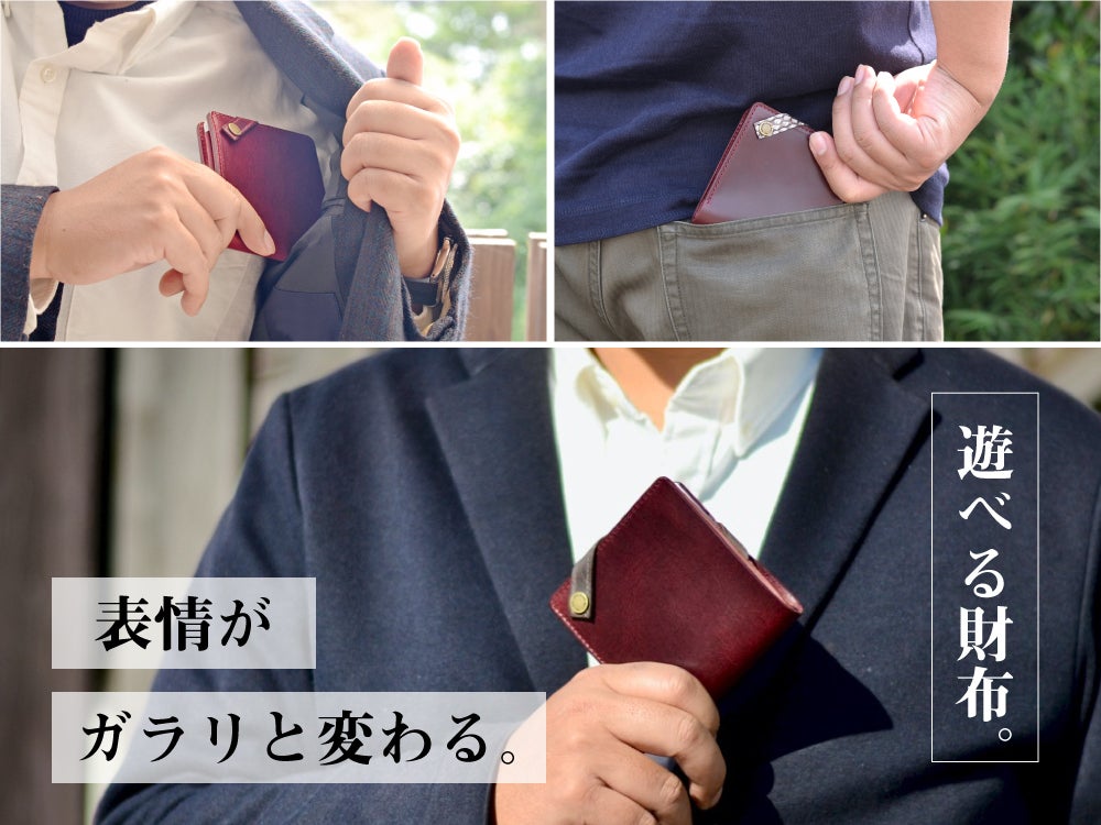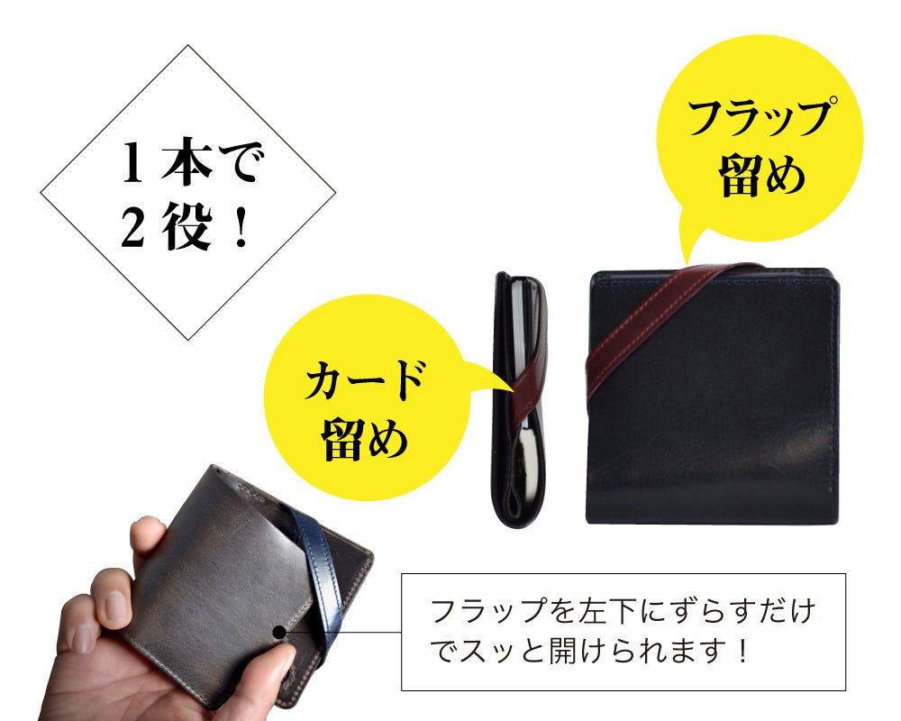 1本で「カードケースの蓋」と「財布のフラップ留め」の役割を果たします。