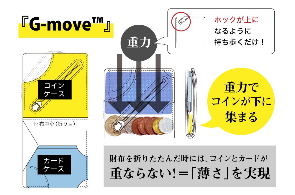 たったこれだけで、重力によってコインが下に集まるのでカードとコインが重ならず、財布の薄さを実現できたのです。