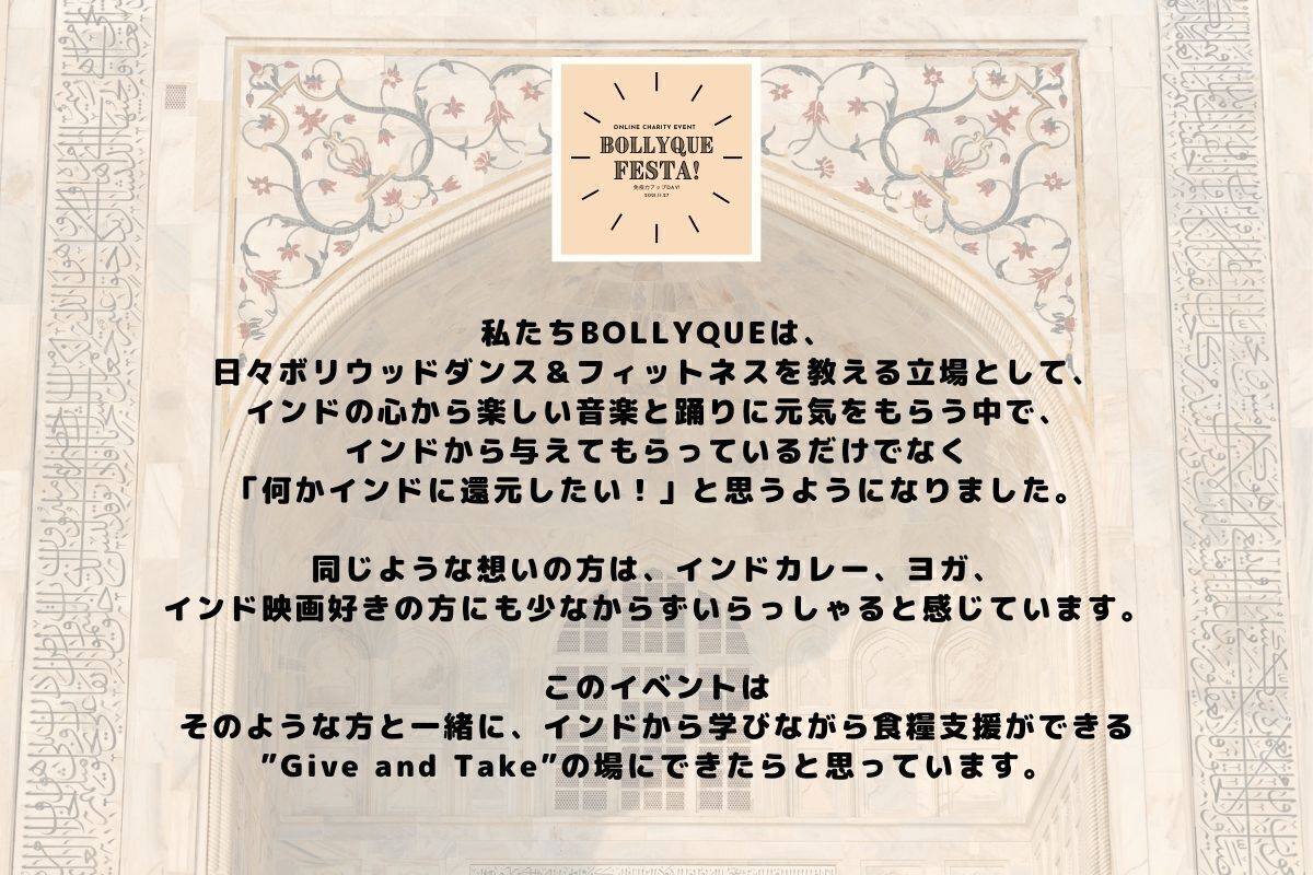 インド料理やヨガ、インド映画がお好きな方々の中には、わたしたちと同じような思いを持たれている方もいらっしゃると感じています。このイベントは、そのような方と一緒にインドから学びながら食糧支援ができる”Give and Take”の場にできたらと思い、企画しました。