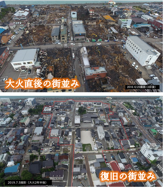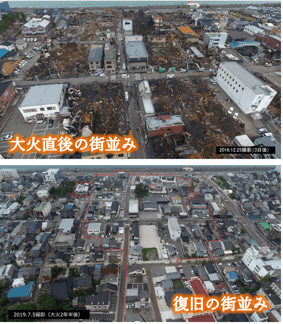 大火によって、慣れ親しんだ街並みは一変しました。被災した人・事業所、そして行政の努力と多くのご支援で街並みは復旧してきています。ただ、糸魚川市民が大火によって負った傷は完治したとは言えない状況です。私たちは、まちの復旧だけでなく心も復興できるようにしたいと想っています。