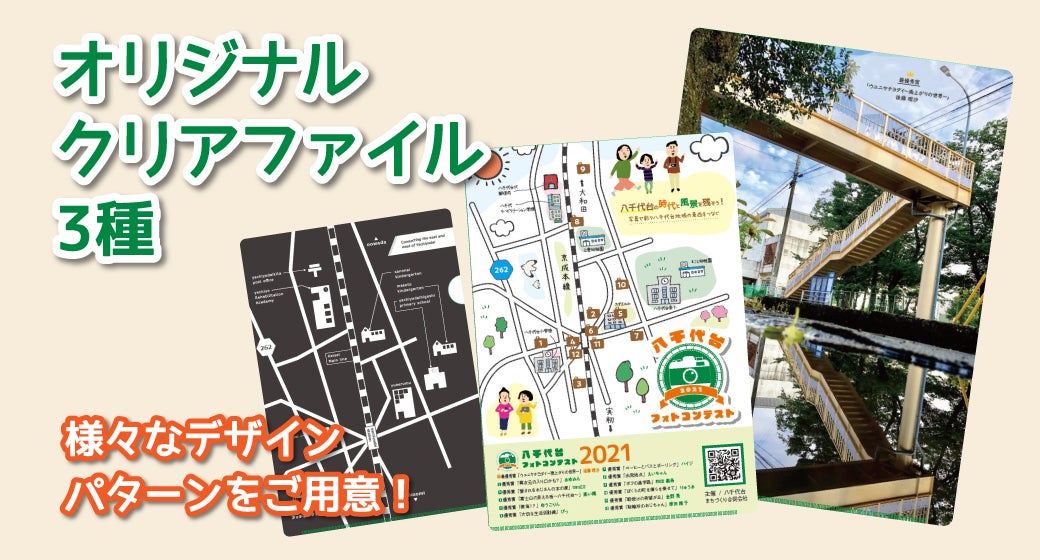 リターン品紹介♪八千代台フォトコンテストオリジナルクリアファイル3種最優秀賞の素敵な作品が映えるクリアファイルや素敵な受賞作品達の撮影スポットが巡れるかわいい八千代台MAP!そして、クールな雰囲気の八千代台ファイル!様々なデザインのクリアファイルが、いろんな場面で活躍!