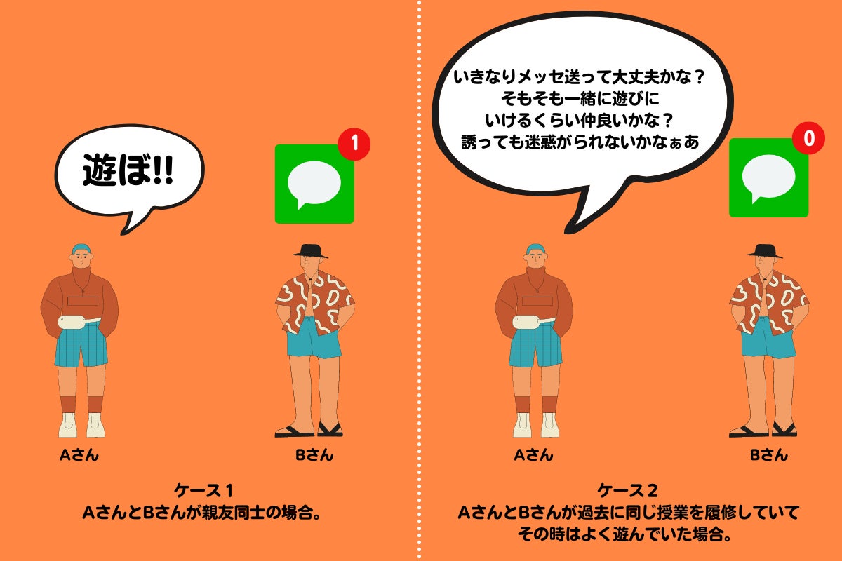 コロナ到来以前は、わざわざ相手を誘わなくとも、大学に行けばあたりまえのように友達と会えることが多かったと思います。また、大学の講義やサークル活動の後に、その場の流れで友達と遊ぶといったことも多くあったと思います。