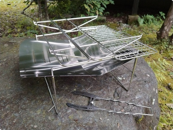 焚き火台だけ渡されてもしょうがないので、焚き火シート(地面を熱から守るために焚き火台の下に敷く難燃性のシート)・火バサミ・着火器具などもお付けします。