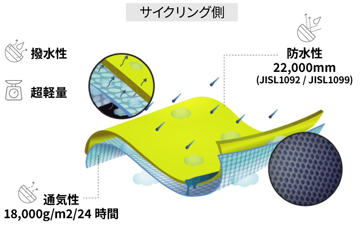 耐水圧の性能と通気性は通常逆行するものですが、MOVAで使用されるLAFTECH社のサイクリング専用素材がその両立を実現させました。