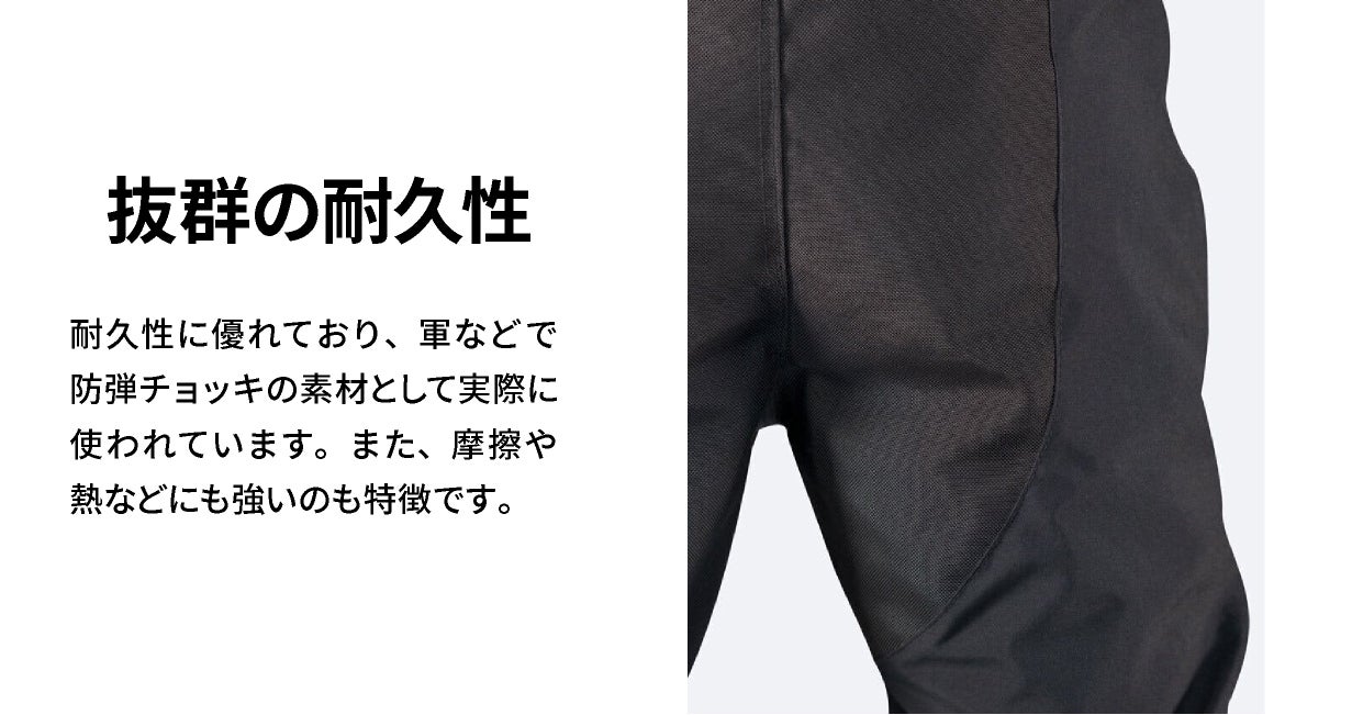 摩擦や引裂き、さらには熱にも強い性質を持ち、一般的なナイロンと比べると約5倍もの強度があると言われています。