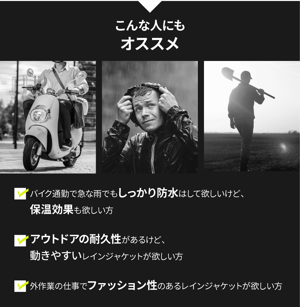 22000mmの耐水圧!雨の日防水するのに蒸れない特殊生地使用。 自転車の事故防止にうってつけ!夜道でも視認性ばっちりの反射板付き ロードバイク乗りの欲しいが詰まった機能の数々! 大容量収納のバックポケットや着脱しやすい両端開閉ジッパー、ハンドルに吊り付けれる収納性が付いた耐久レインジャケット