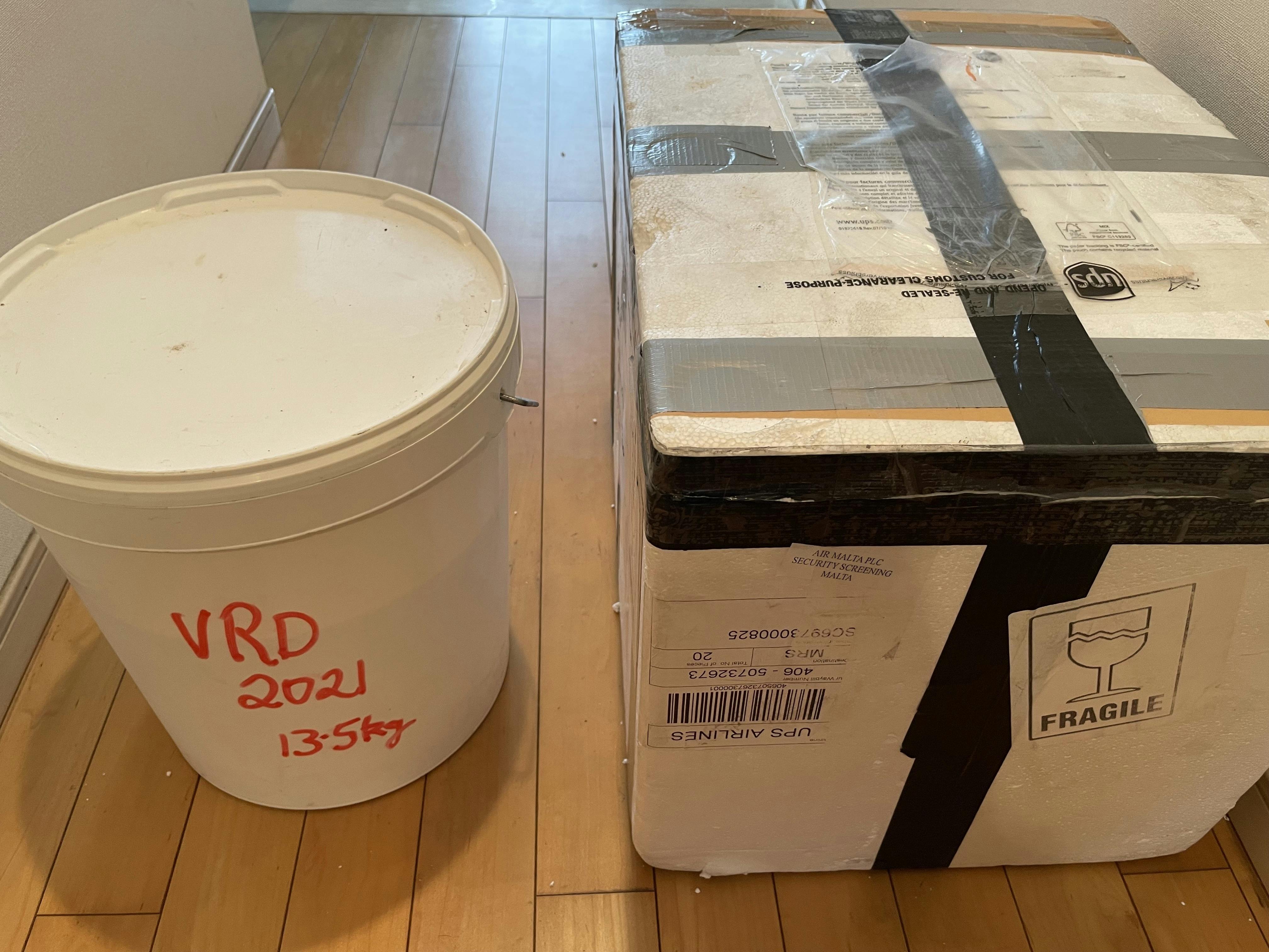 そして養蜂場の皆様ともSNSを通して親しくなり、薬剤師を休業しマルタ産希少ハチミツ輸入販売業「ブルーハニー」として起業することになりました。このような木箱で蜂蜜が輸送されてきます。もちろん検疫所に対して食品輸入届は提出しております。また各種品質試験もクリアしております。