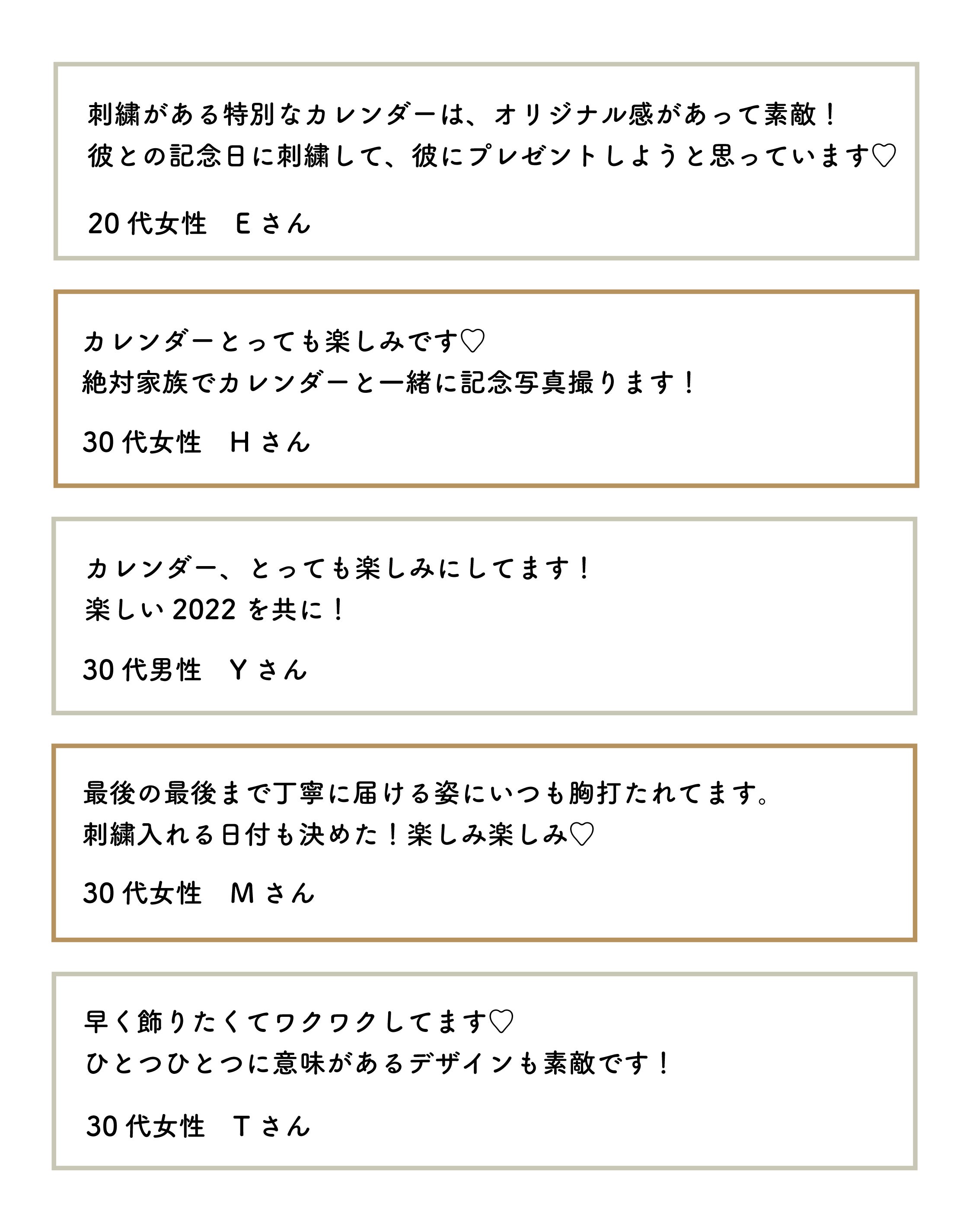 ※ご自分で刺繍できるセルフ刺繍用のカレンダーもございます。刺繍ありのものと間違えて応援購入しないようにお気をつけください。