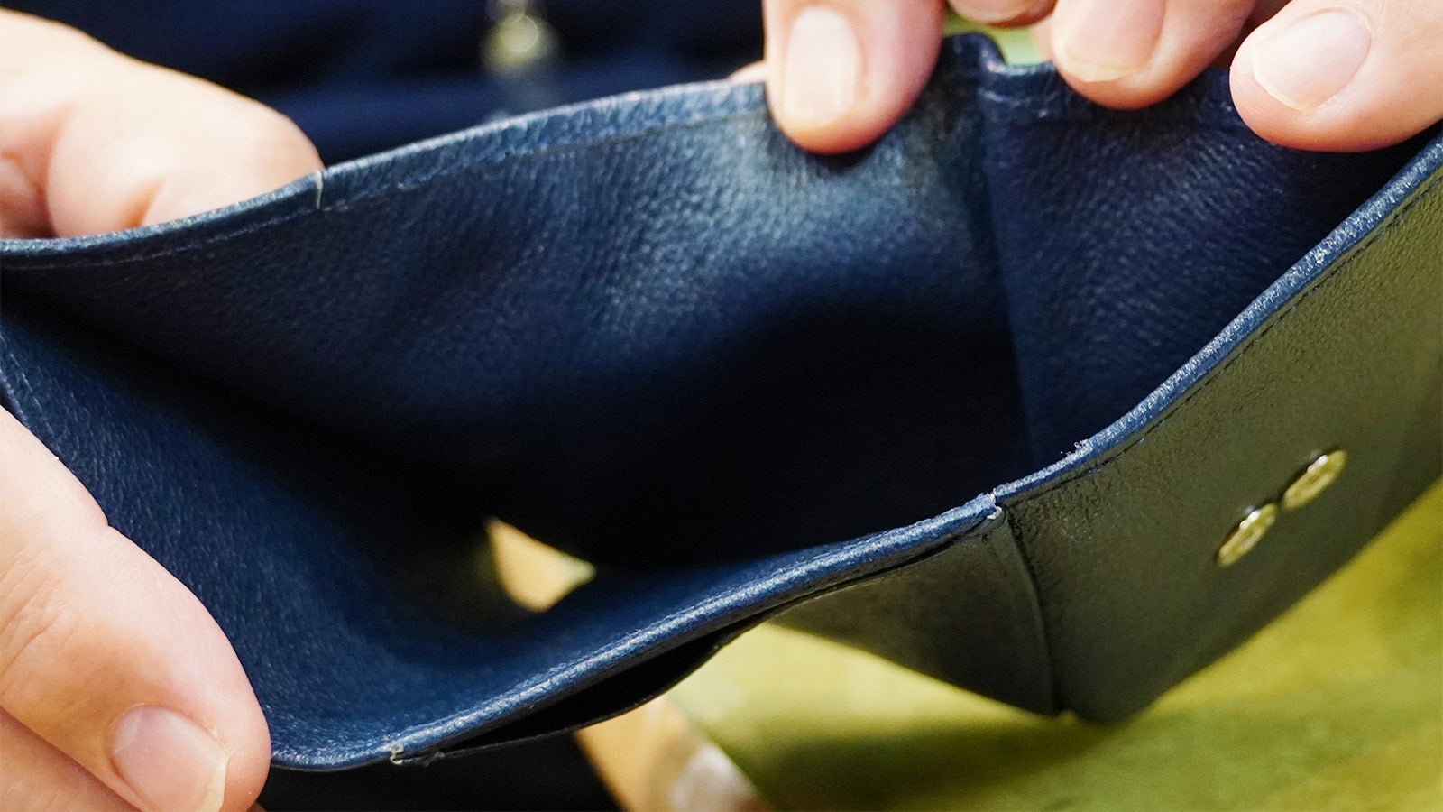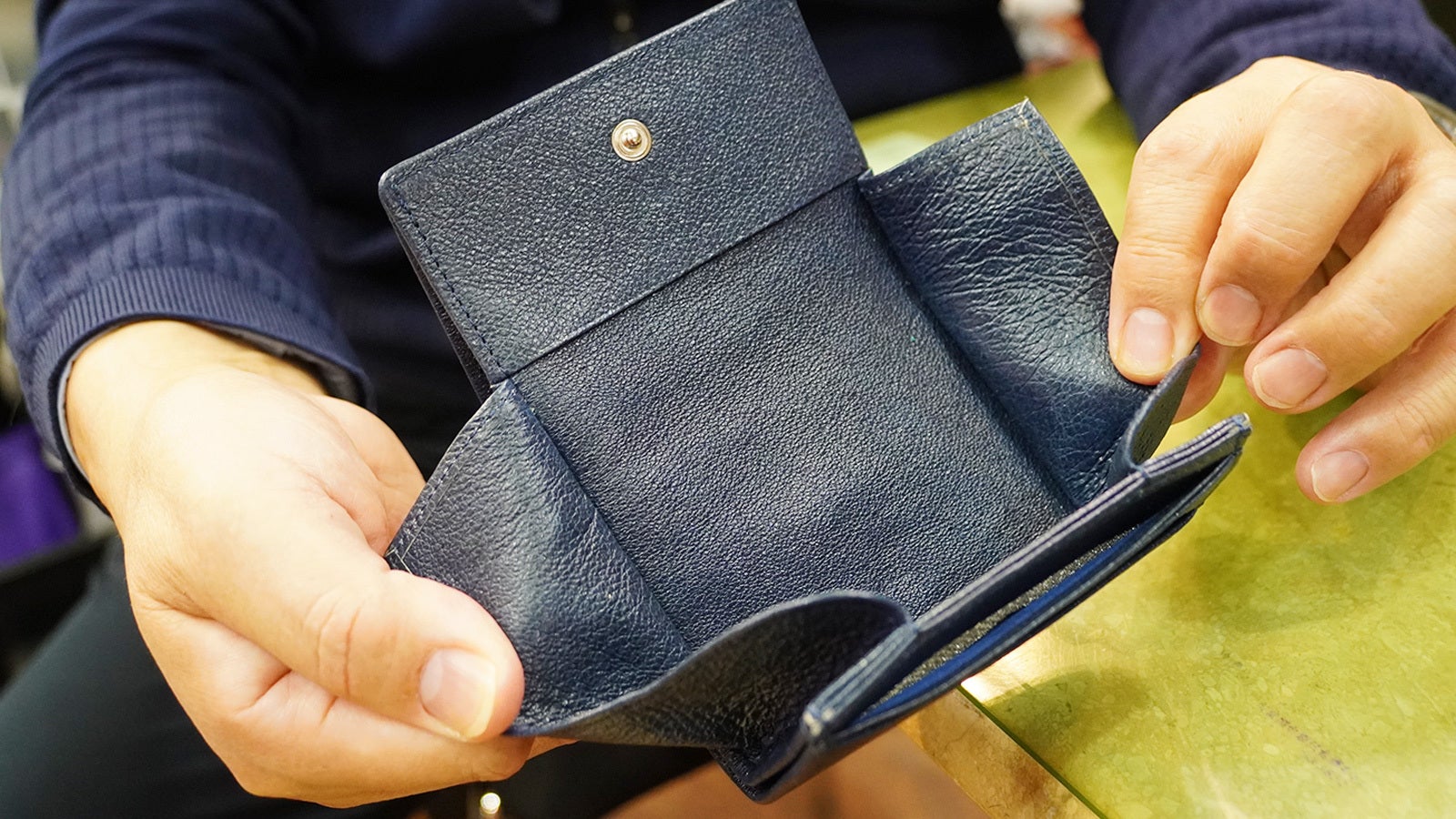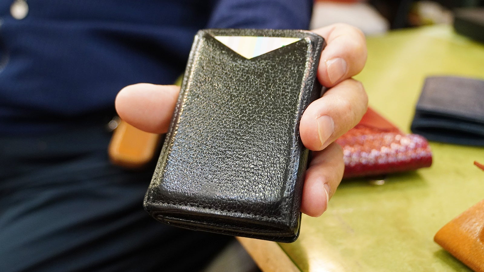 こちらはその愛用品。使うたびに手になじんで柔らかくなり、しかもツヤツヤ。この艶も二宮さん独自の技術で今回のウォレットに施されています。