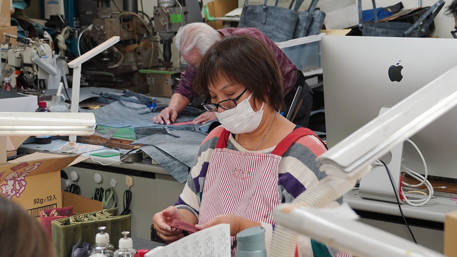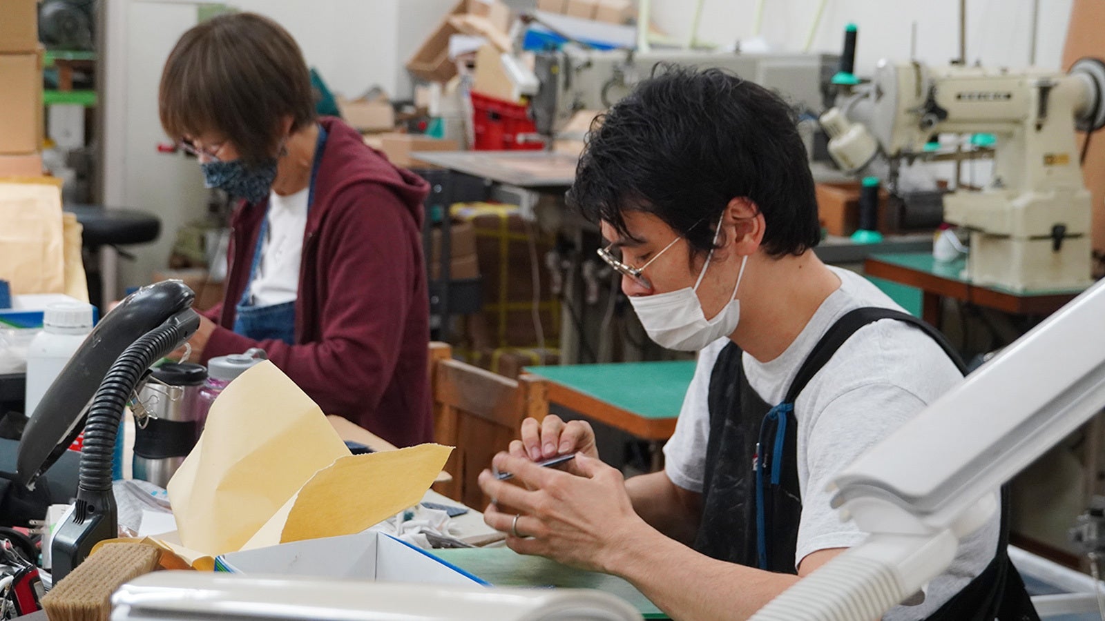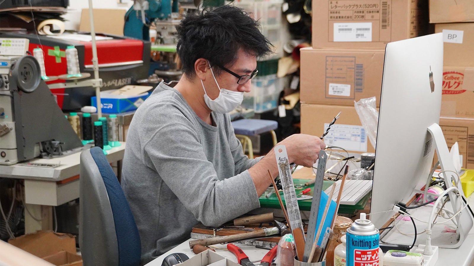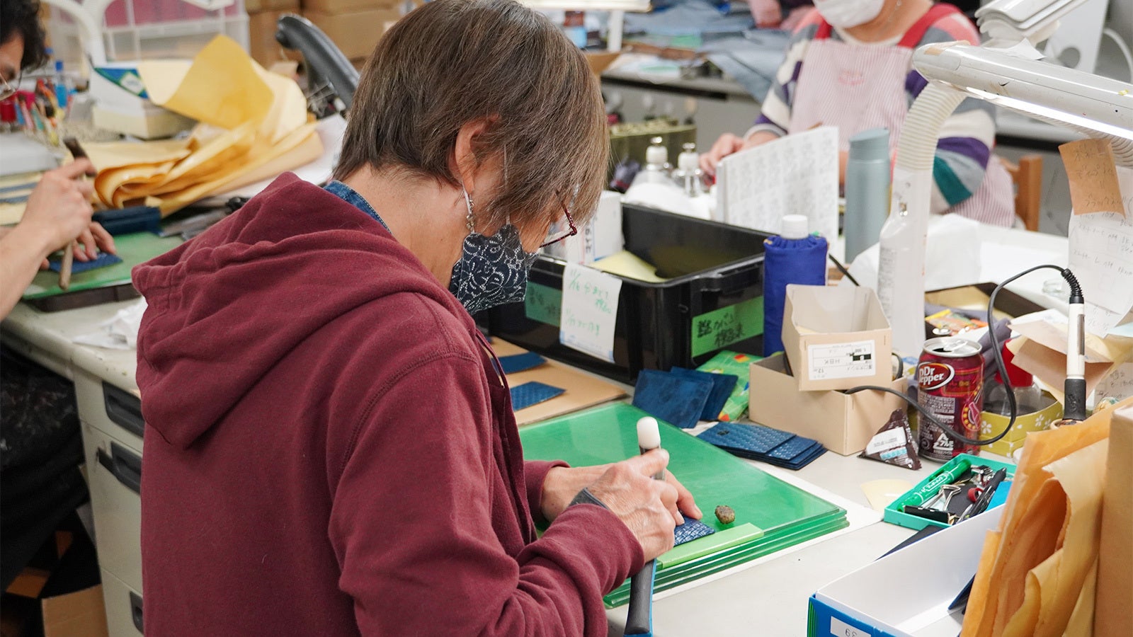 ところせましと機材や素材が並べられている社内の制作スペースでは、8人の専門職の方々によって様々な製品が一つひとつ丁寧に創られています。