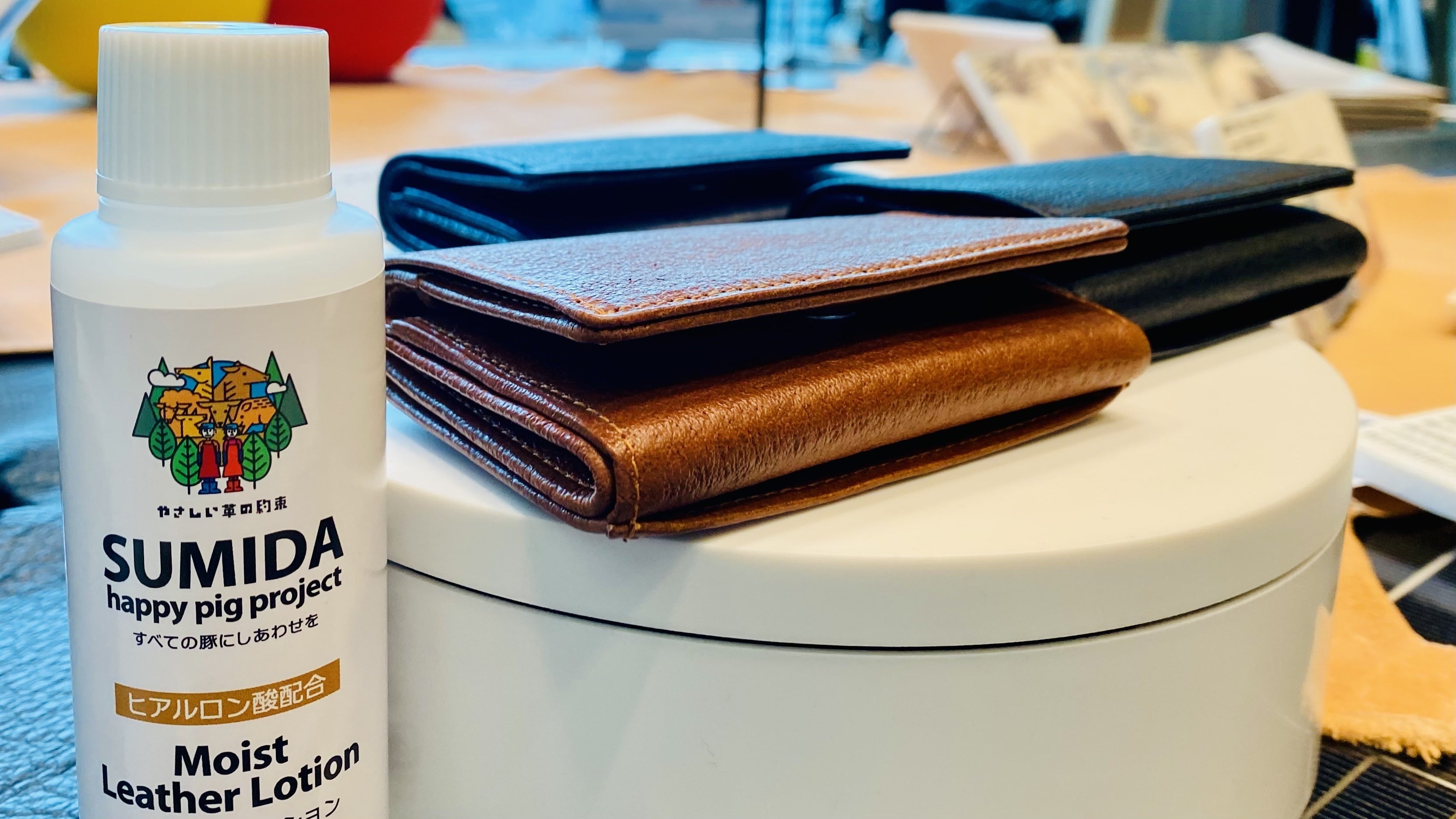 ミニウォレットは普段、バッグやポケットに入れて持ち歩くものなので、ローションはよい香りであることにもこだわっています。ヒアルロン酸で革に栄養を与えつつ、表面に美しい艶もでますので、長く付き合う相棒として合わせて愛用いただければ嬉しく思います。
