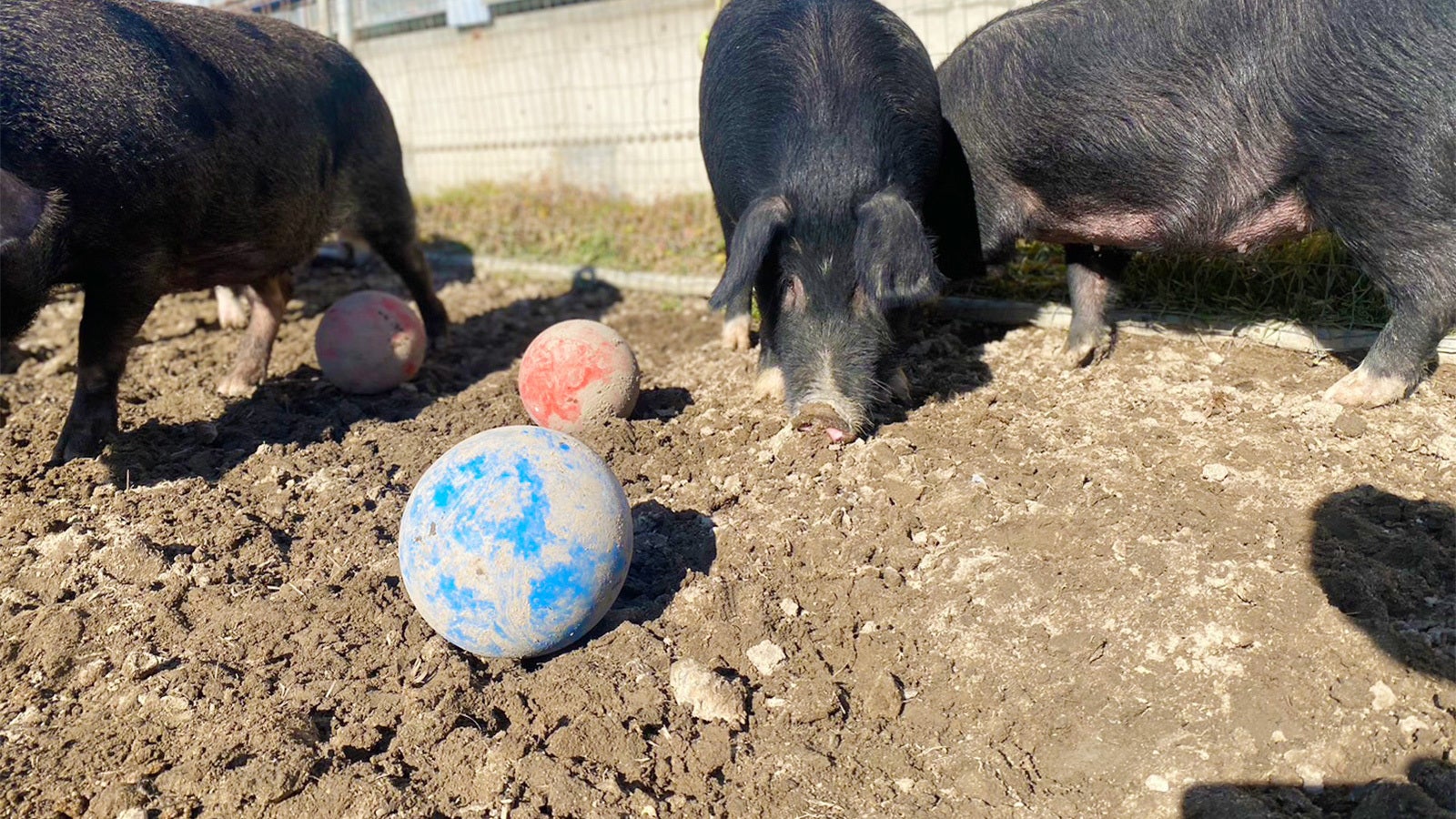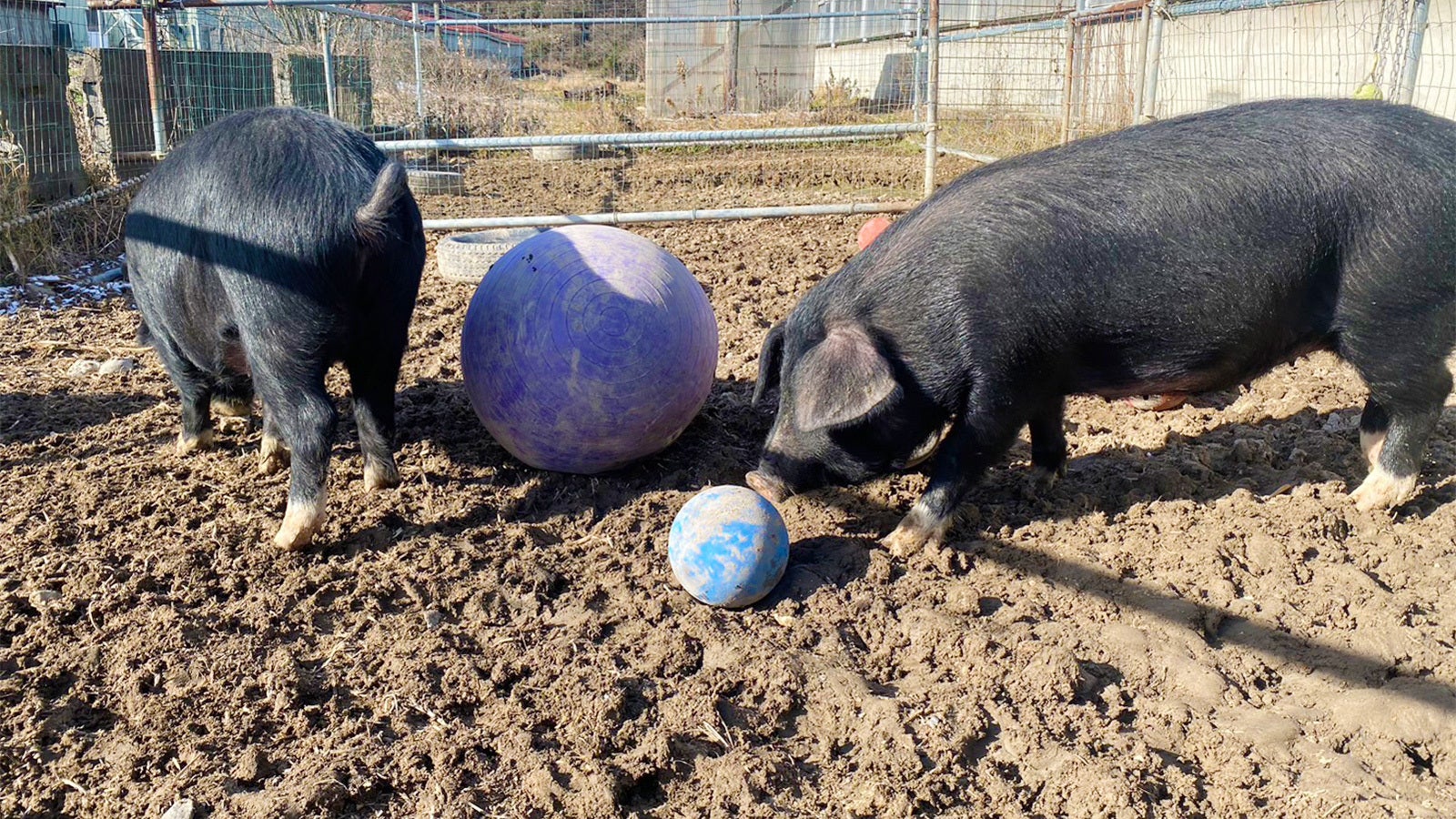 オス豚もメス豚も大喜びしていますが、オス豚は普段から一頭だけで管理されていることが多いので、よりボール遊びが楽しいようです。オス豚の方がストレス軽減目的でのボール遊びは有意義かもしれません。