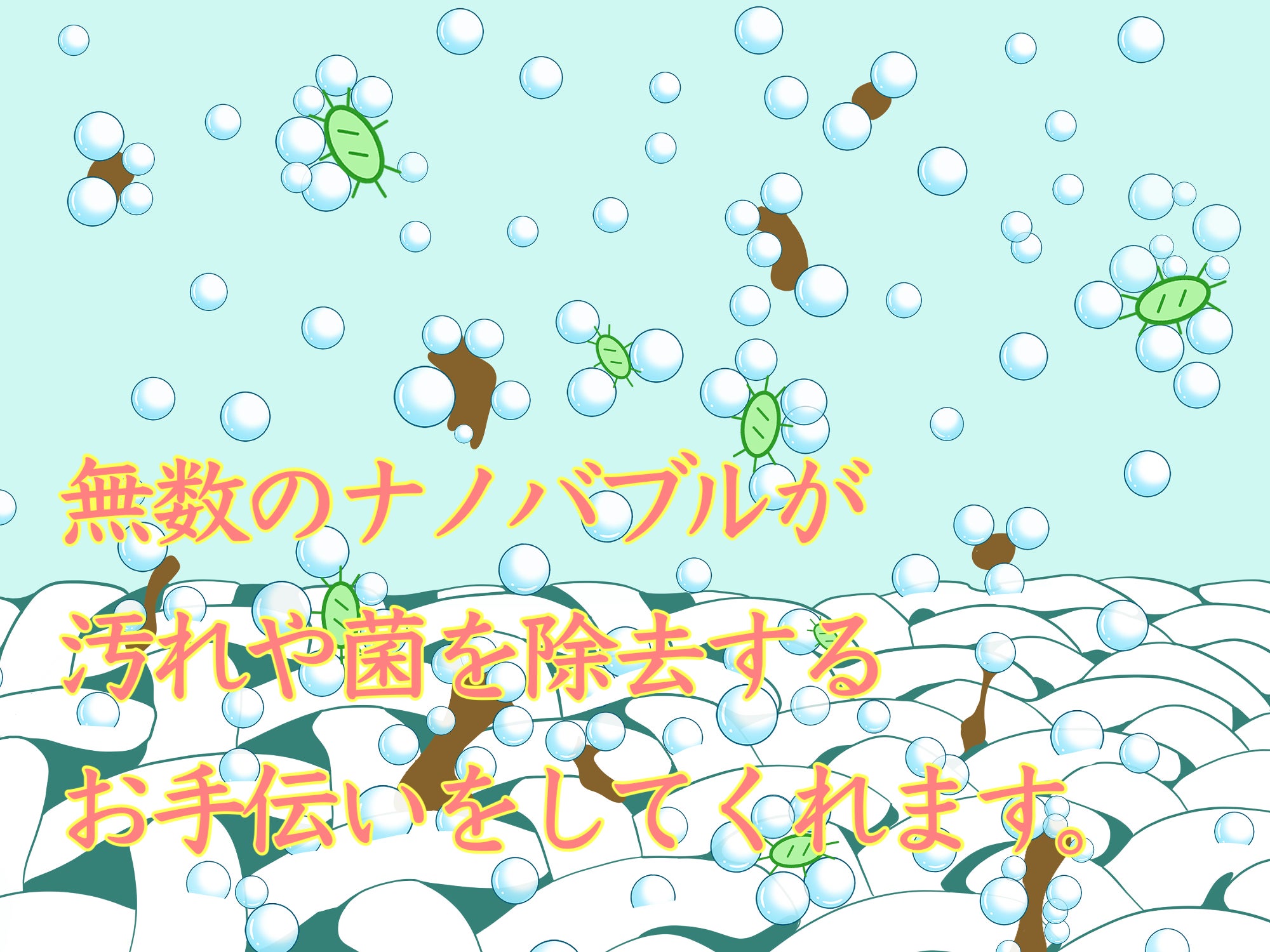 ・ナノバブルだけで全ての汚れが落ちるわけではありません。落ちない汚れは洗剤などの使用をおすすめします。