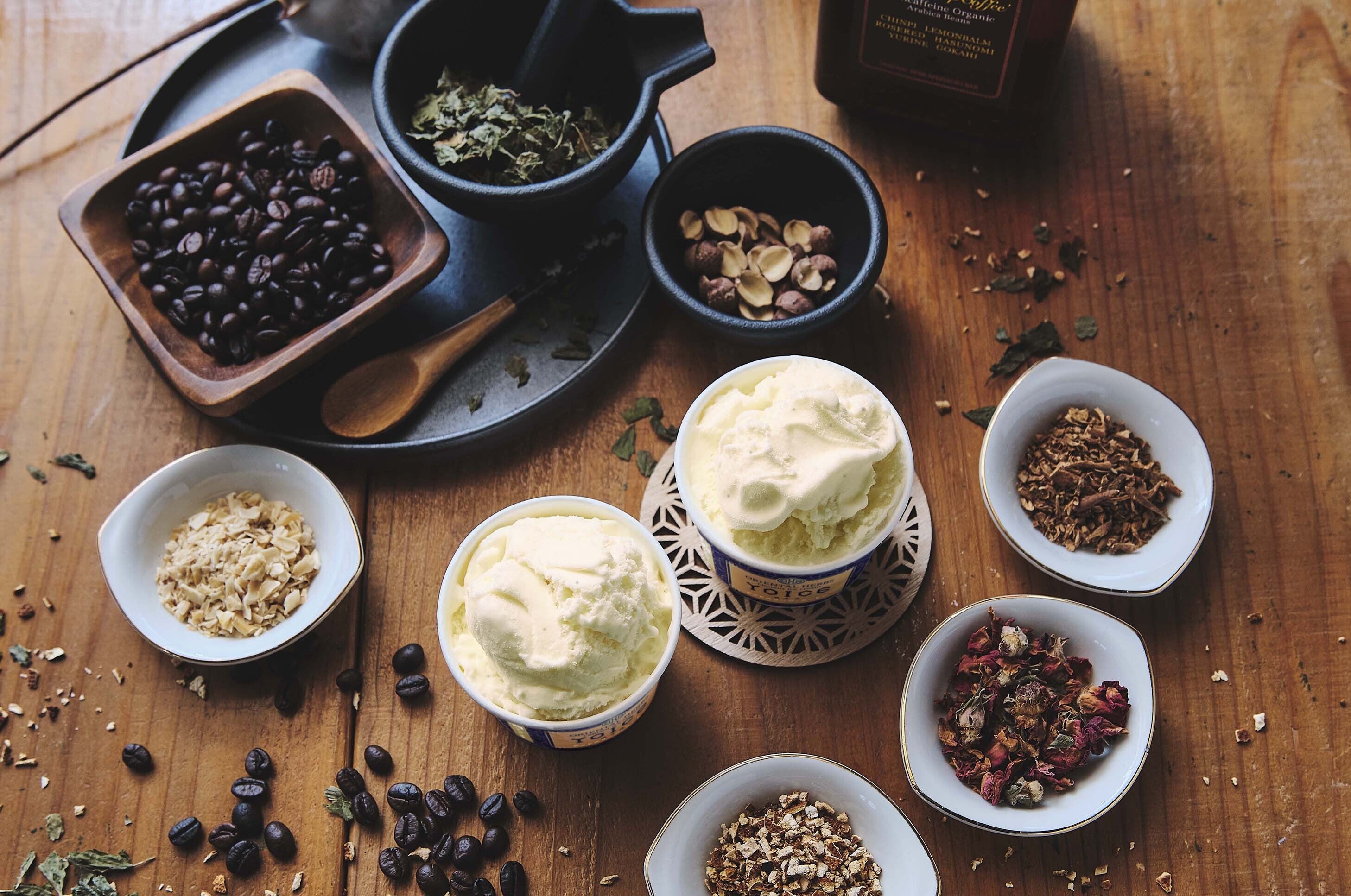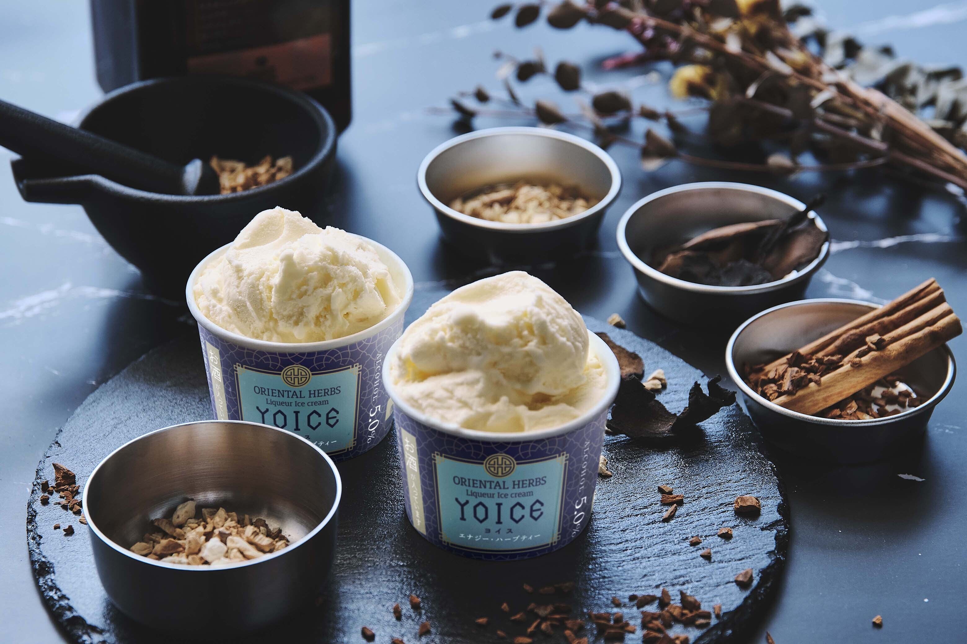「YOICE(ヨイス)」はアルコール度数約5%のリキュールアイスクリームで、希少なハーブをふんだんに練りこみ、食べてキレイ・罪悪感のないアイスクリームを目指しました。