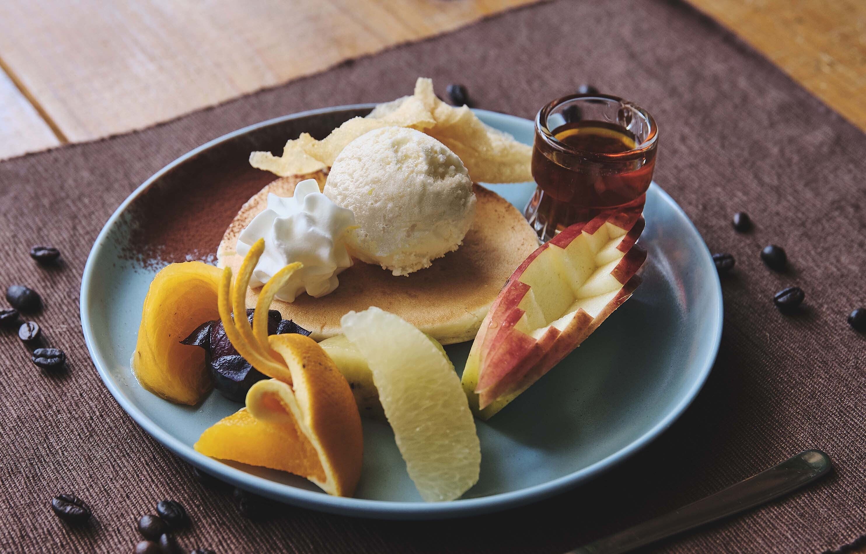 ぶどうは皮目に十字にカットして手で剥き、リンゴは皮目をV字に3回入れて左右交互にカットします。オレンジは皮目を2回包丁入れて、一番下の皮目に3回包丁を入れて尖りを作り指でくるりと回す。グレープフルーツはむき身にして一口大カット、柿も一口大カット、キウイフルーツも皮を剥いて一口大カットにします。パンケーキにグッドスリープ・コーヒーと生クリーム、シロップを添えて完成です。
