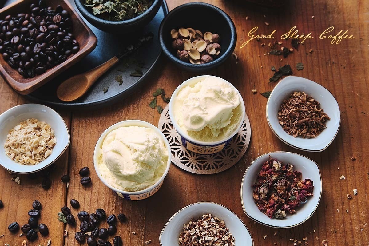 コーヒー好きの安眠酒。身体を温める陳皮、リラックスのレモンバーム、安眠のユリ根、ホルモンバランスを整えるローズレッド、疲労回復の蓮の実、気持ちを前向きにする五加皮と、世界大会で二度優勝したコロンビア産のオーガニックスペシャリティノンカフェインコーヒーをブレンドしたものを漬け込みました。カフェオレ風味のノンカフェイン安眠アイスクリームです。
